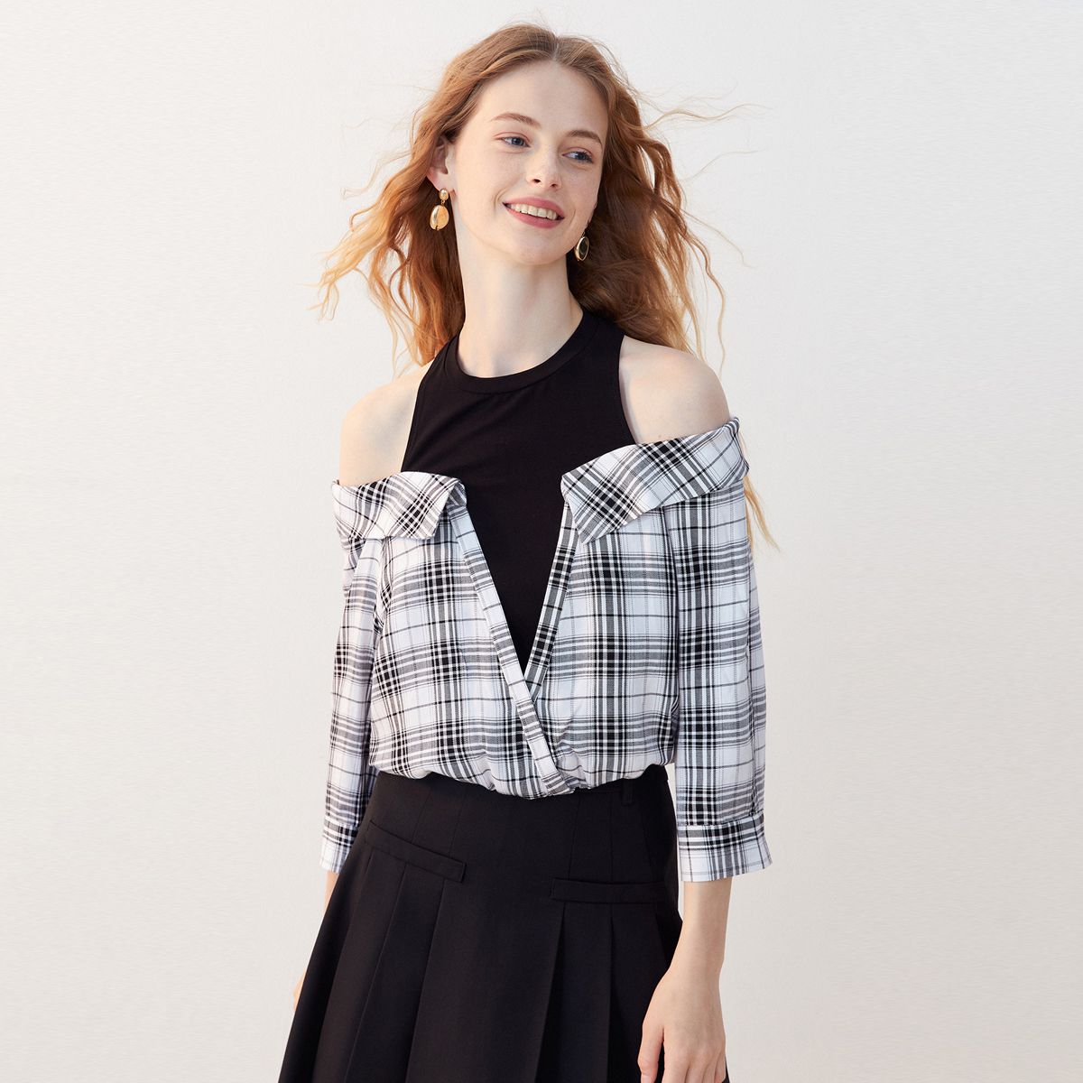 【拼接假两件】春夏专柜款一字肩针织格纹衬衫气质百搭时尚 871121