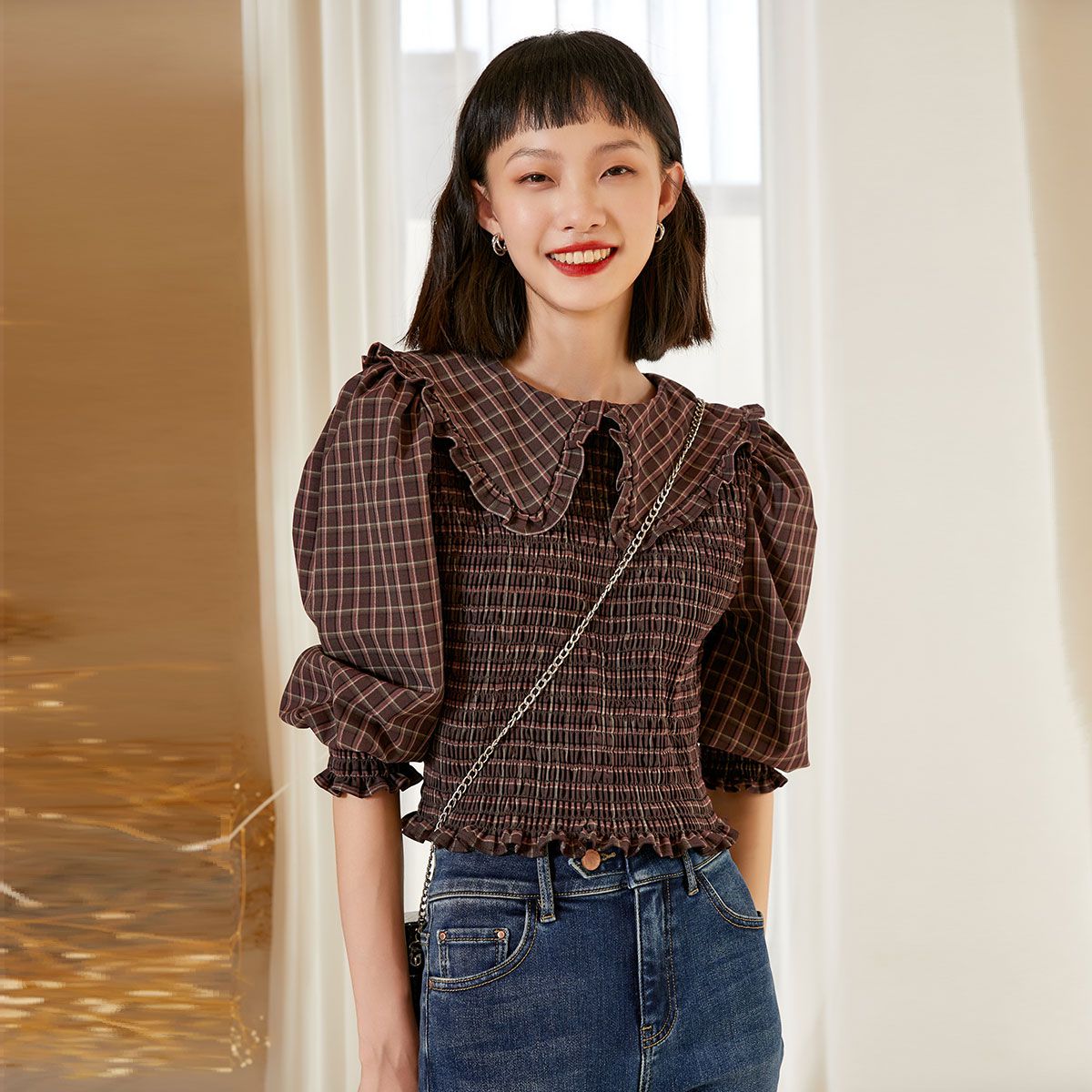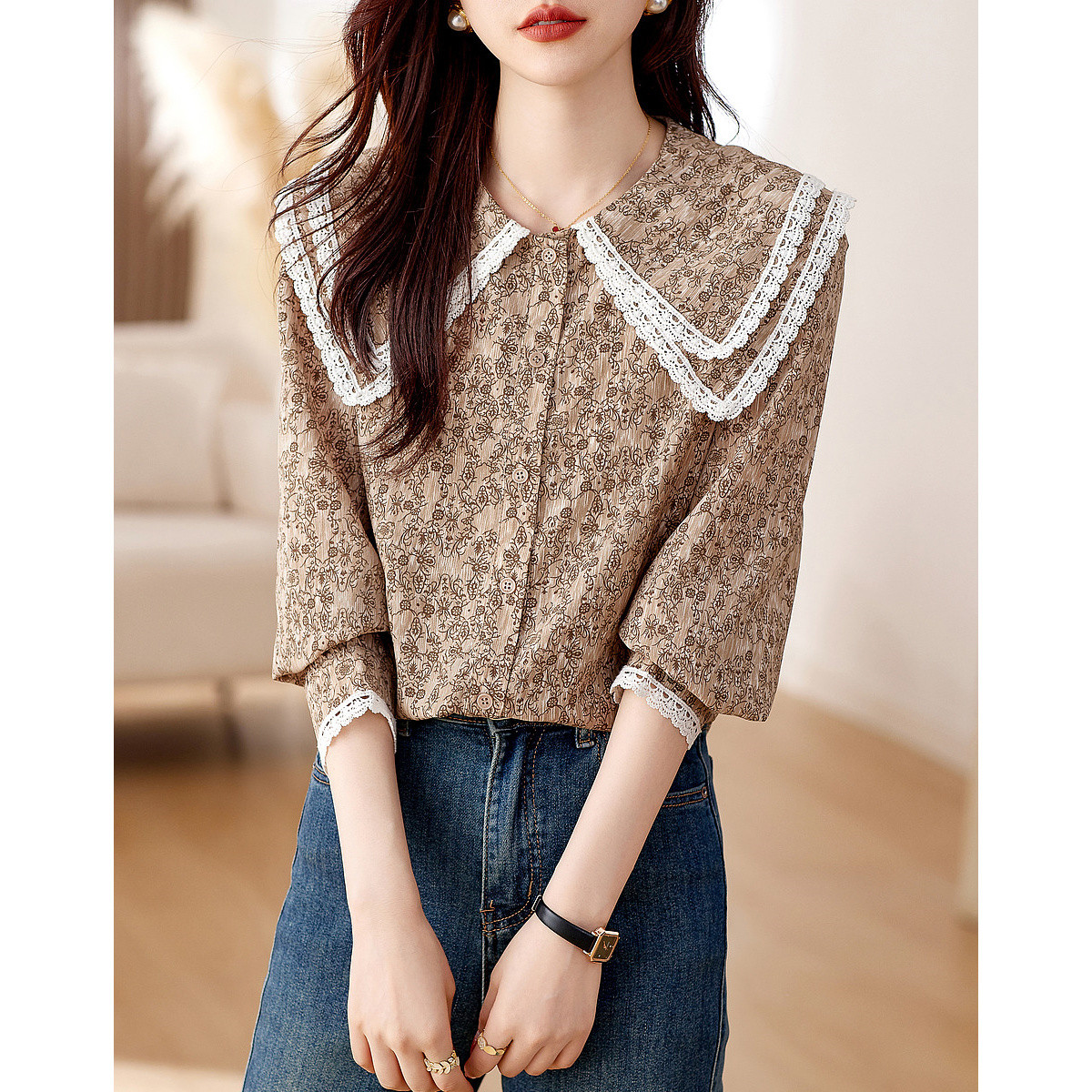 【复古甜美撞色碎花衬衫】秋双层领灯笼袖衬衣上衣 311169