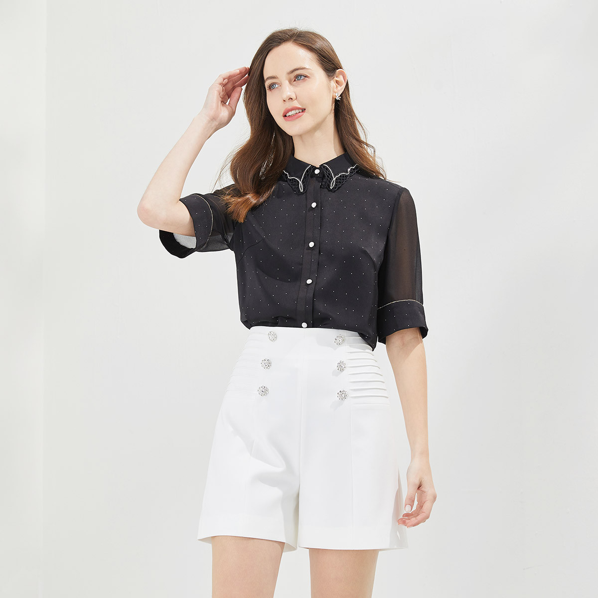 夏装领子钉珠波点舒适休闲百搭五分袖女式衬衫 417119