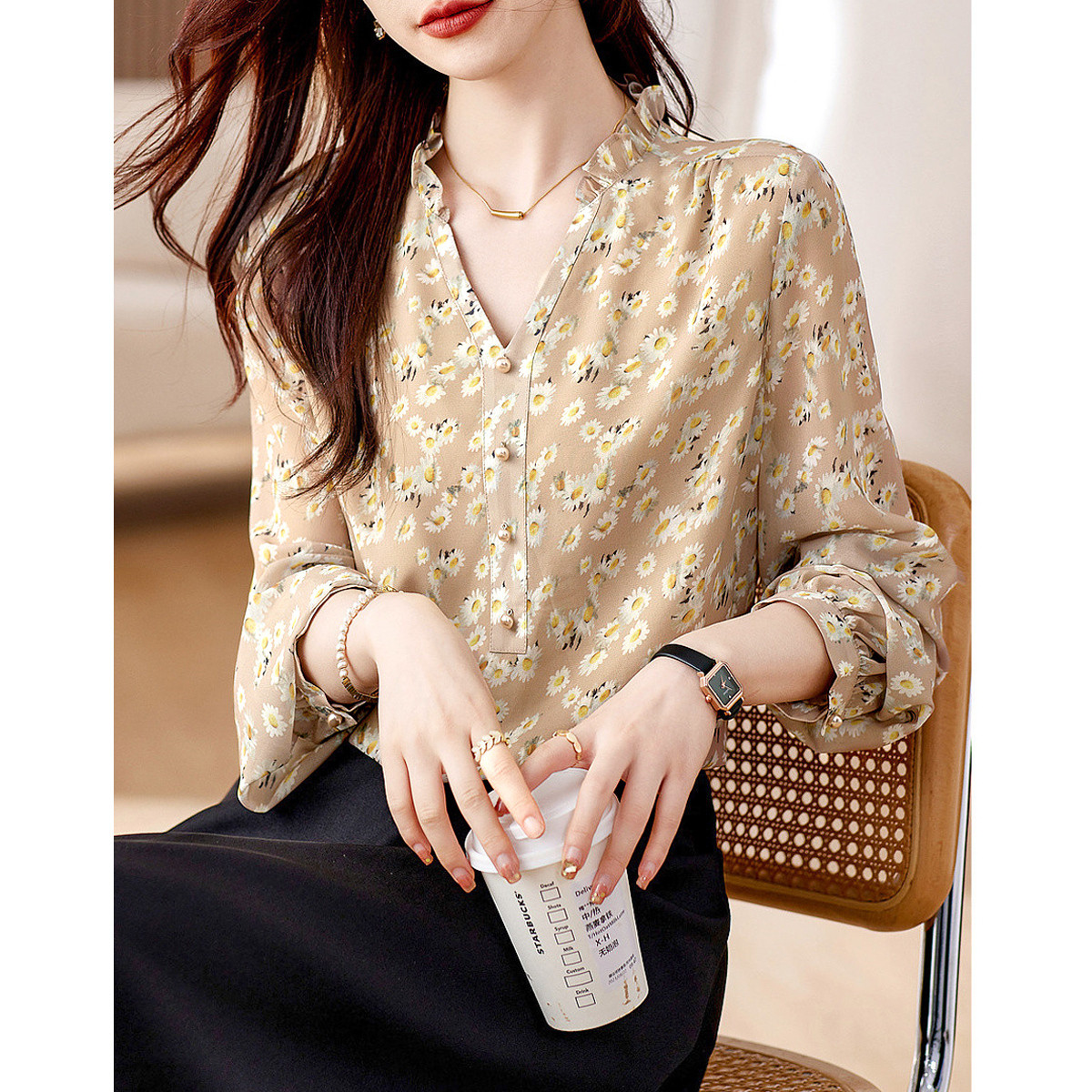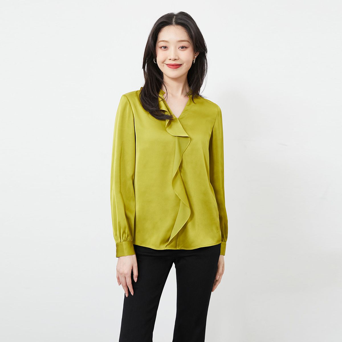 【顺滑面料V领荷叶边设计】春夏优雅舒适上衣女气质百搭时尚 624401