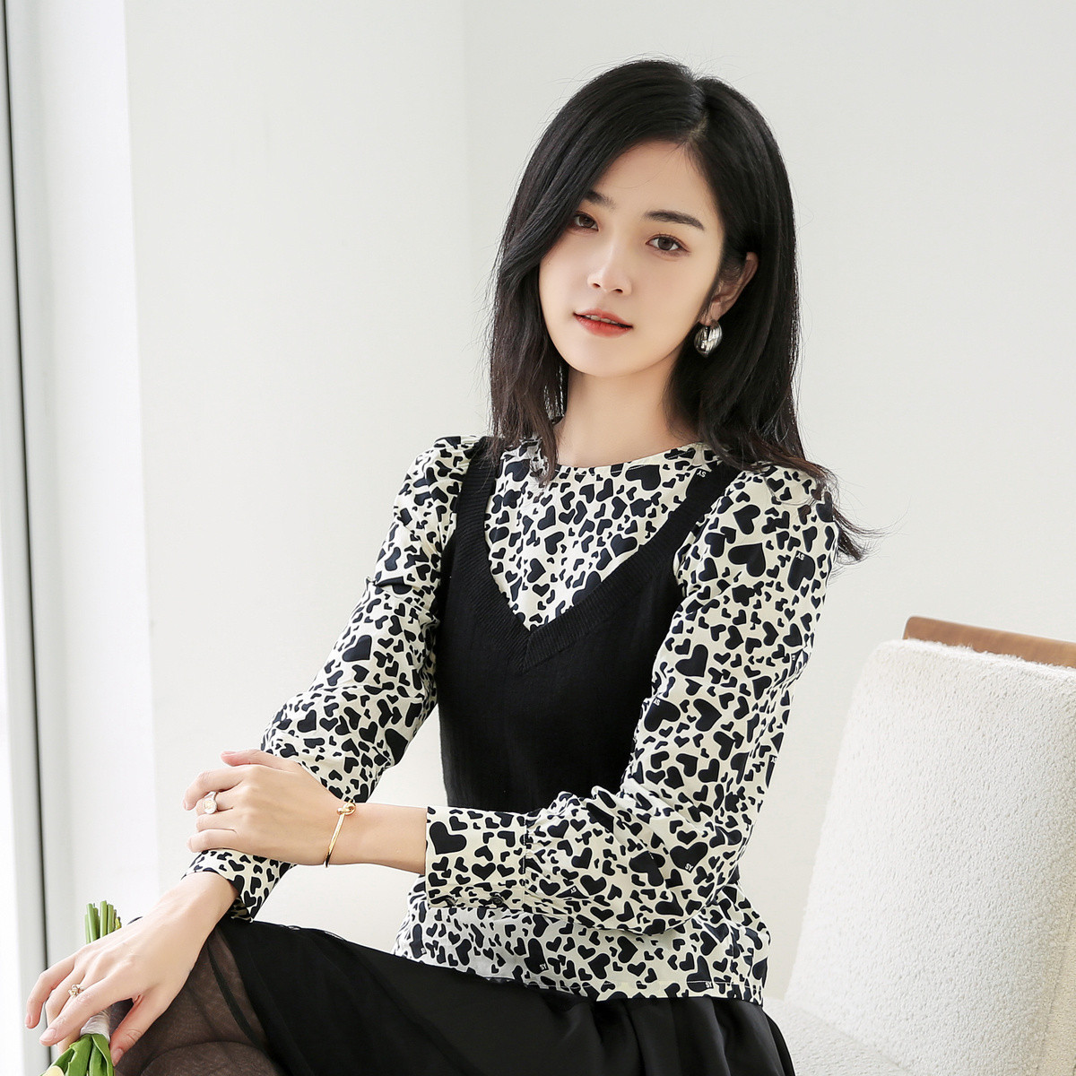 【两件套】设计感小众衬衫女春秋时尚显瘦衬衣女减龄爱心上衣女 360387