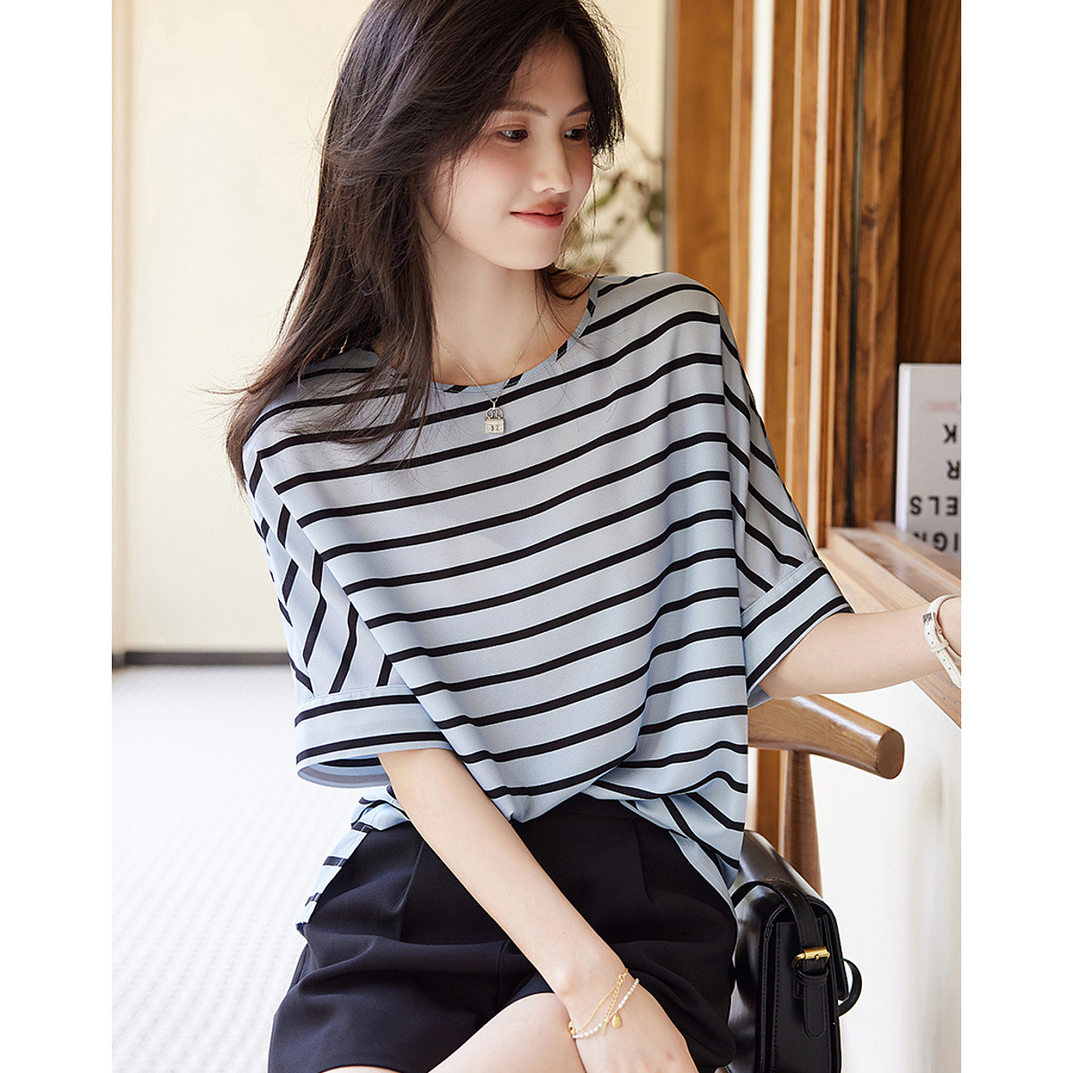 【专柜同款】优雅气质露肩条纹通勤七分袖上衣女衬衫 660945