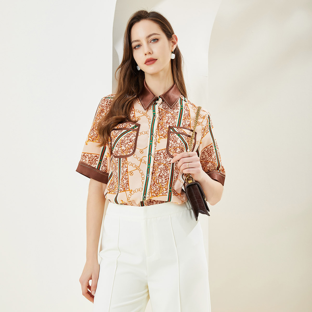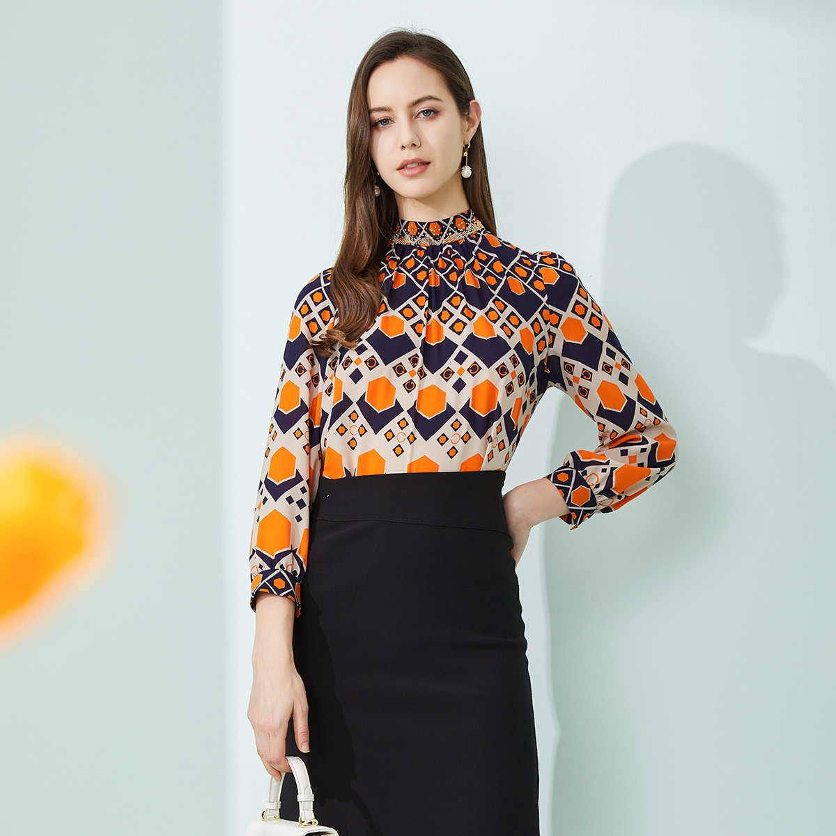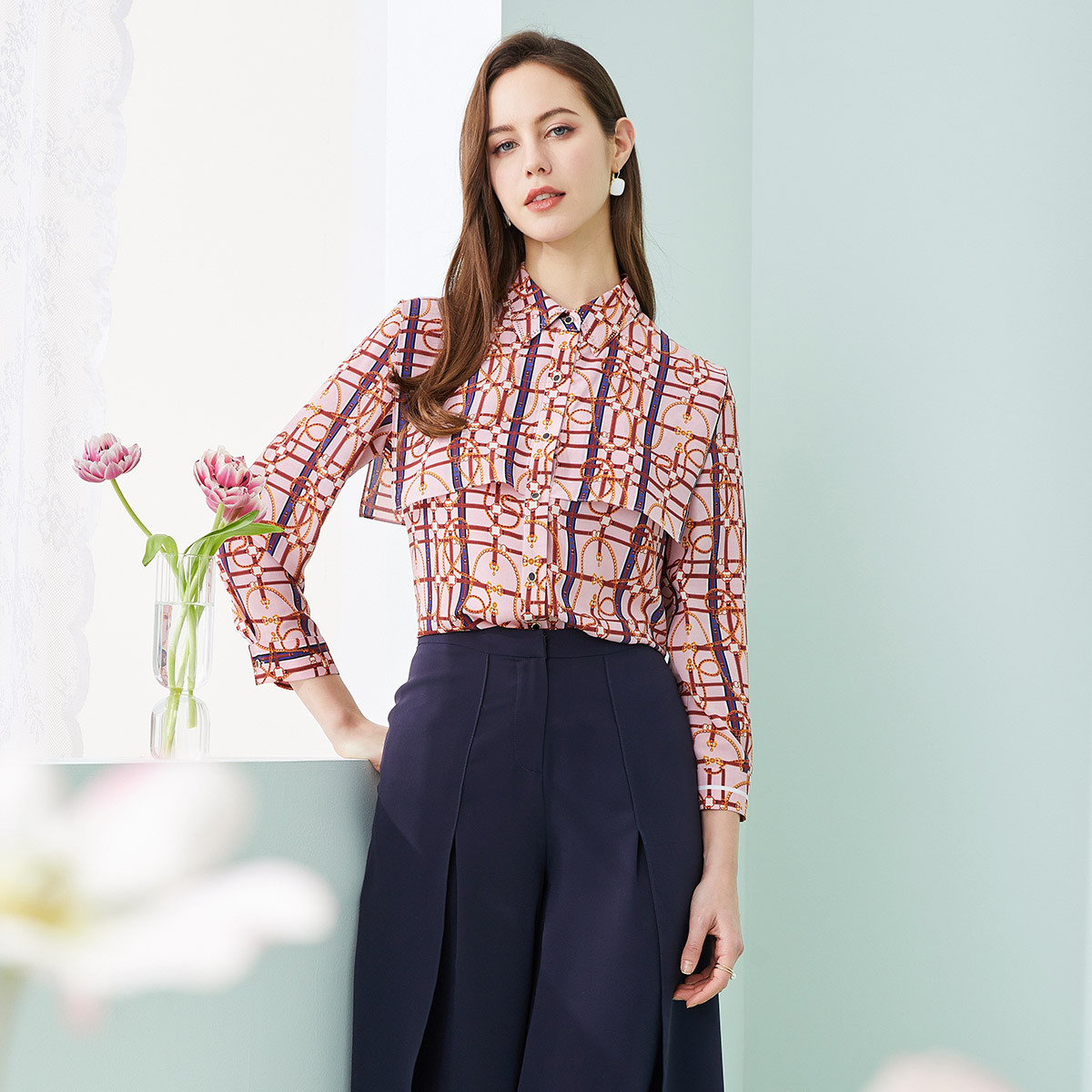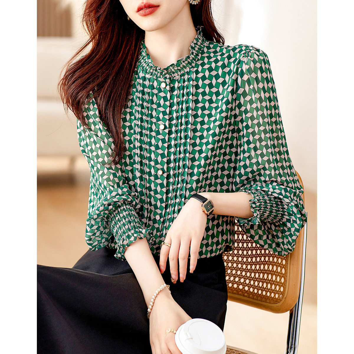 商场同款春季通勤立领几何印花法式气质长袖衬衣 961375