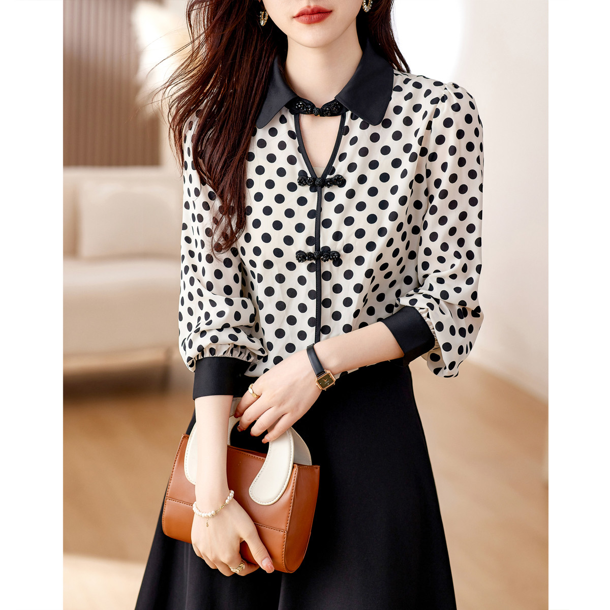 【中式波点衬衫】秋季翻领盘扣撞色衬衣女装上衣 436097