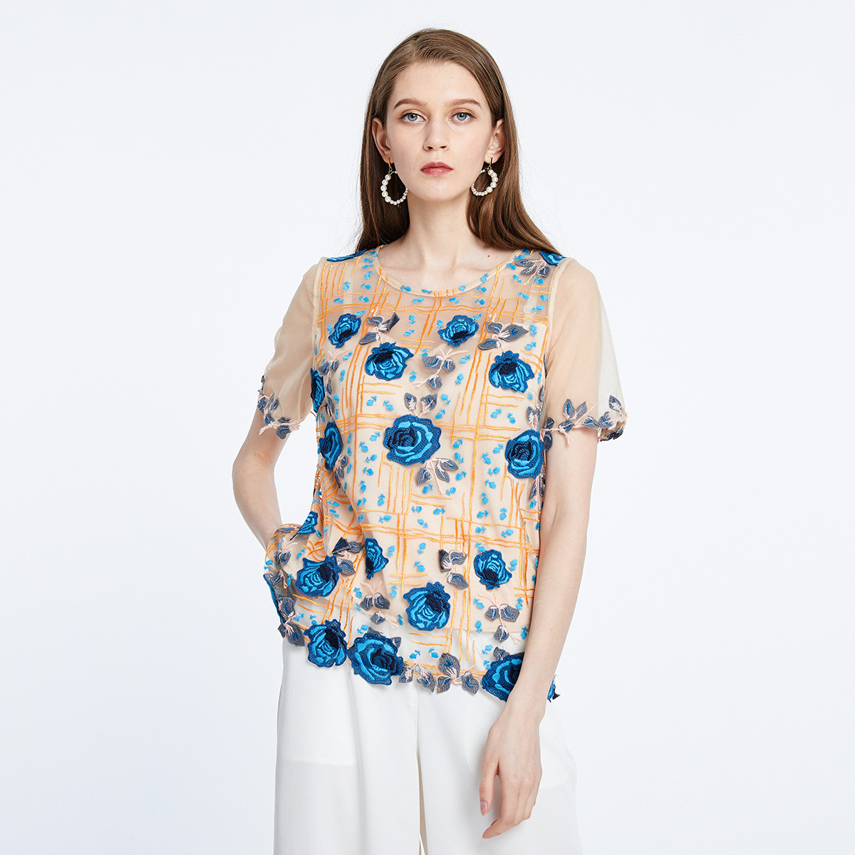 商场同款蕾丝常规修身优雅短袖上衣 659167