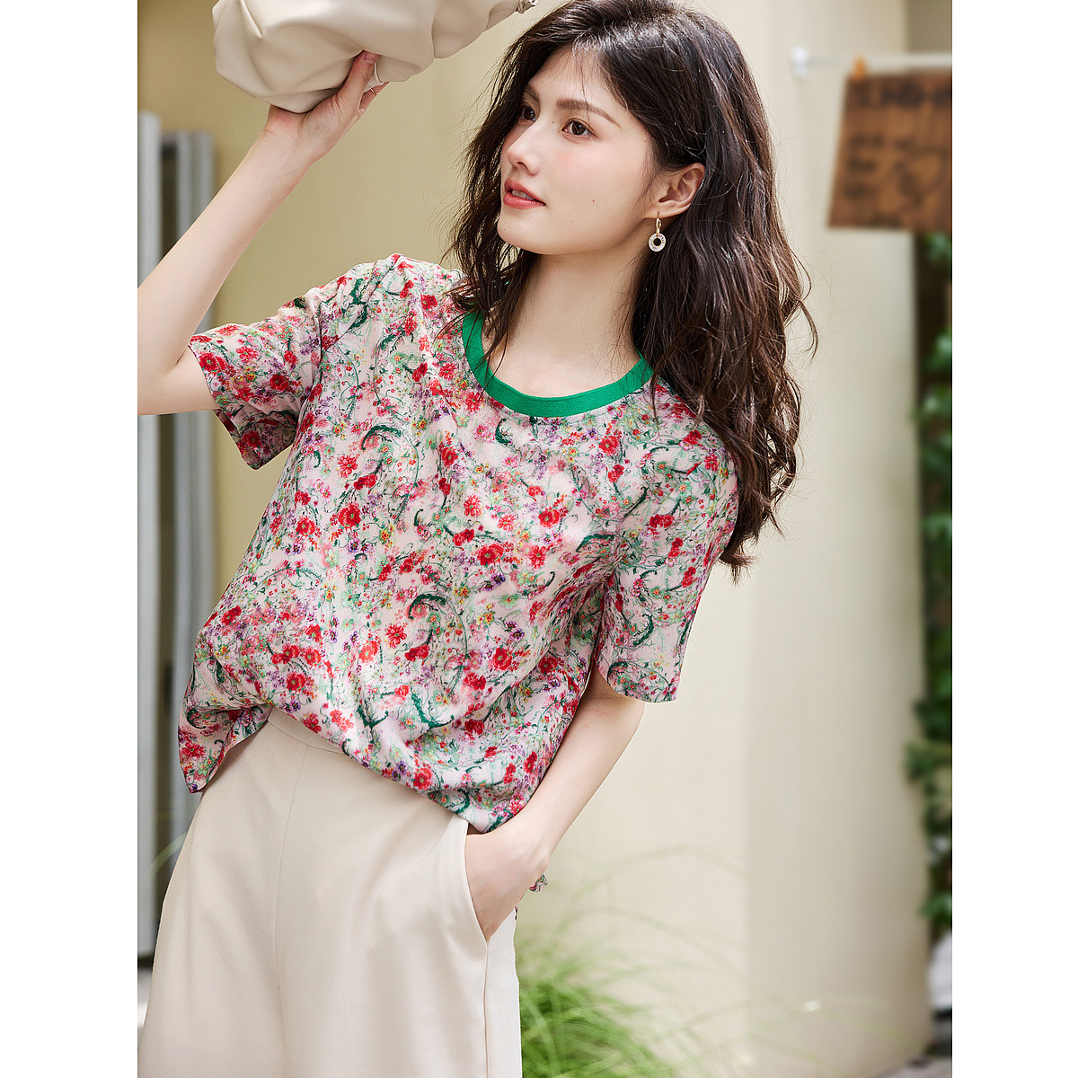 【温柔风仿真丝皱花雪纺衬衫】夏款圆领撞色直筒衬衣女装上衣 120769
