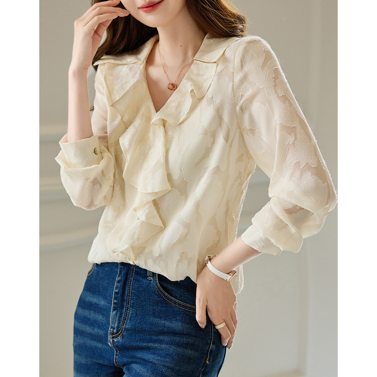 【优雅烧花气质衬衫】秋V领荷叶边长袖衬衣女装上衣 764673