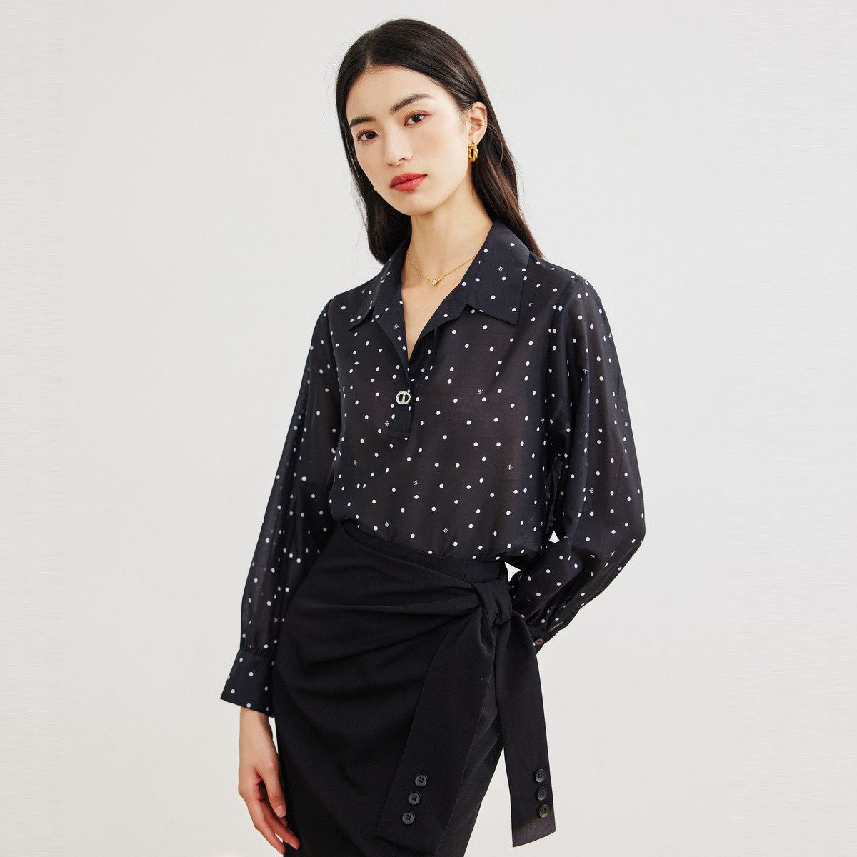 设计感黑色波点长袖衬衫女春秋薄轻熟法式小众雪纺上衣女通勤衬衣 062467