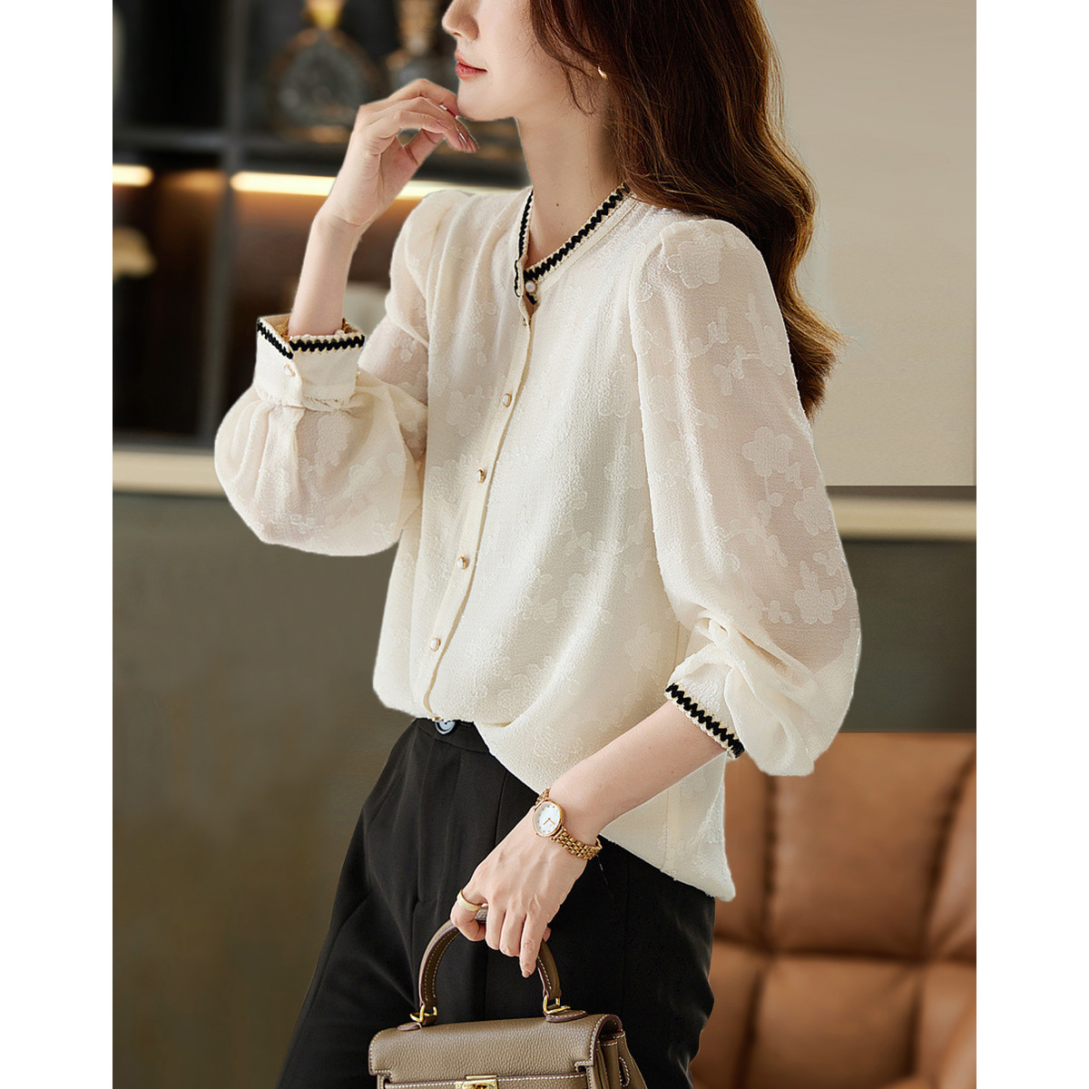 【立体烧花气质衬衫】春秋立领提花长袖衬衣女装上衣 321409