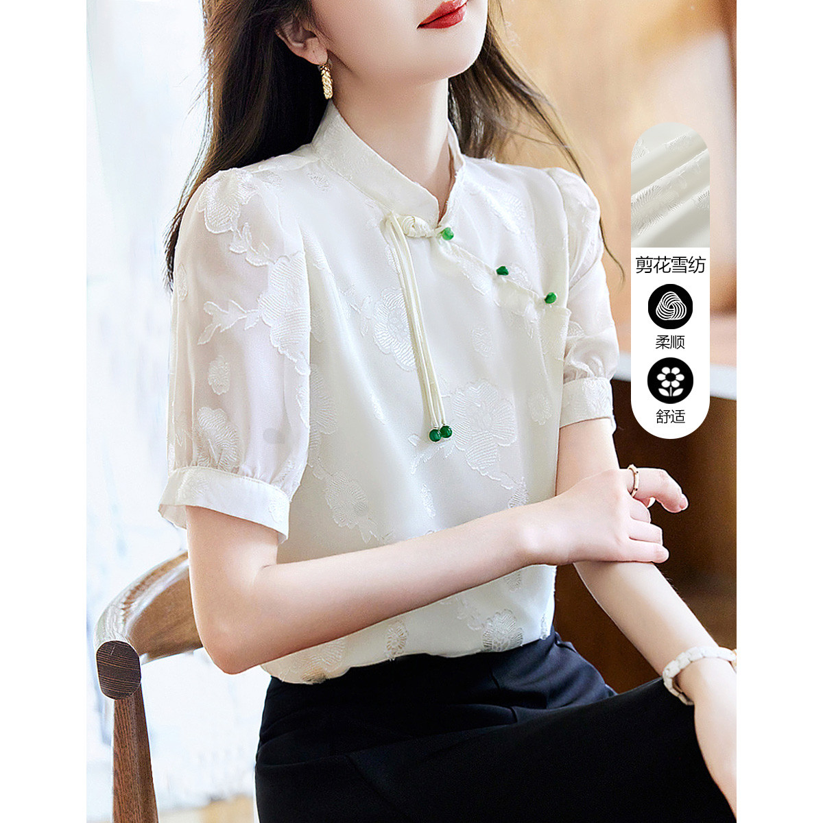 【梦江南】夏国风新中式剪花雪纺衬衫斜襟立领盘扣绿珠衬衣女上衣 683009