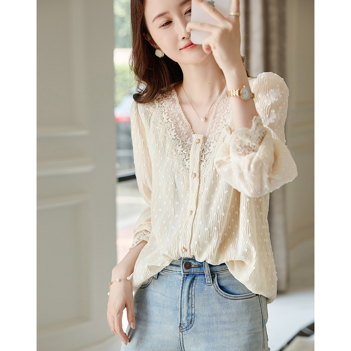 【法式提花压褶蕾丝拼接衬衫】春秋V领泡泡袖衬衣女上衣 309121