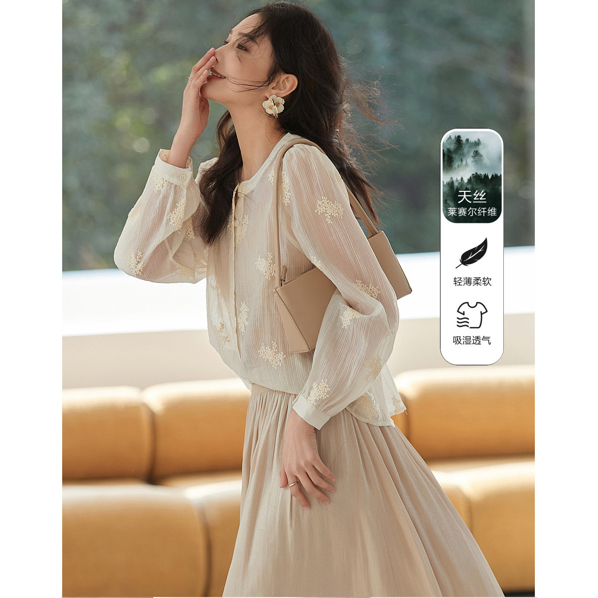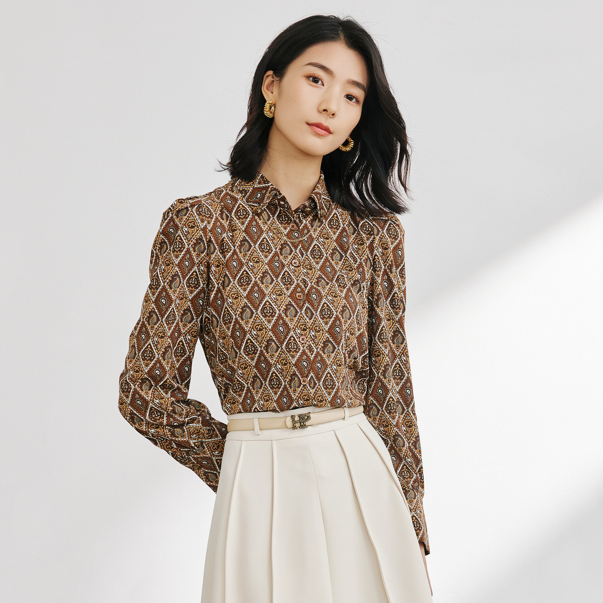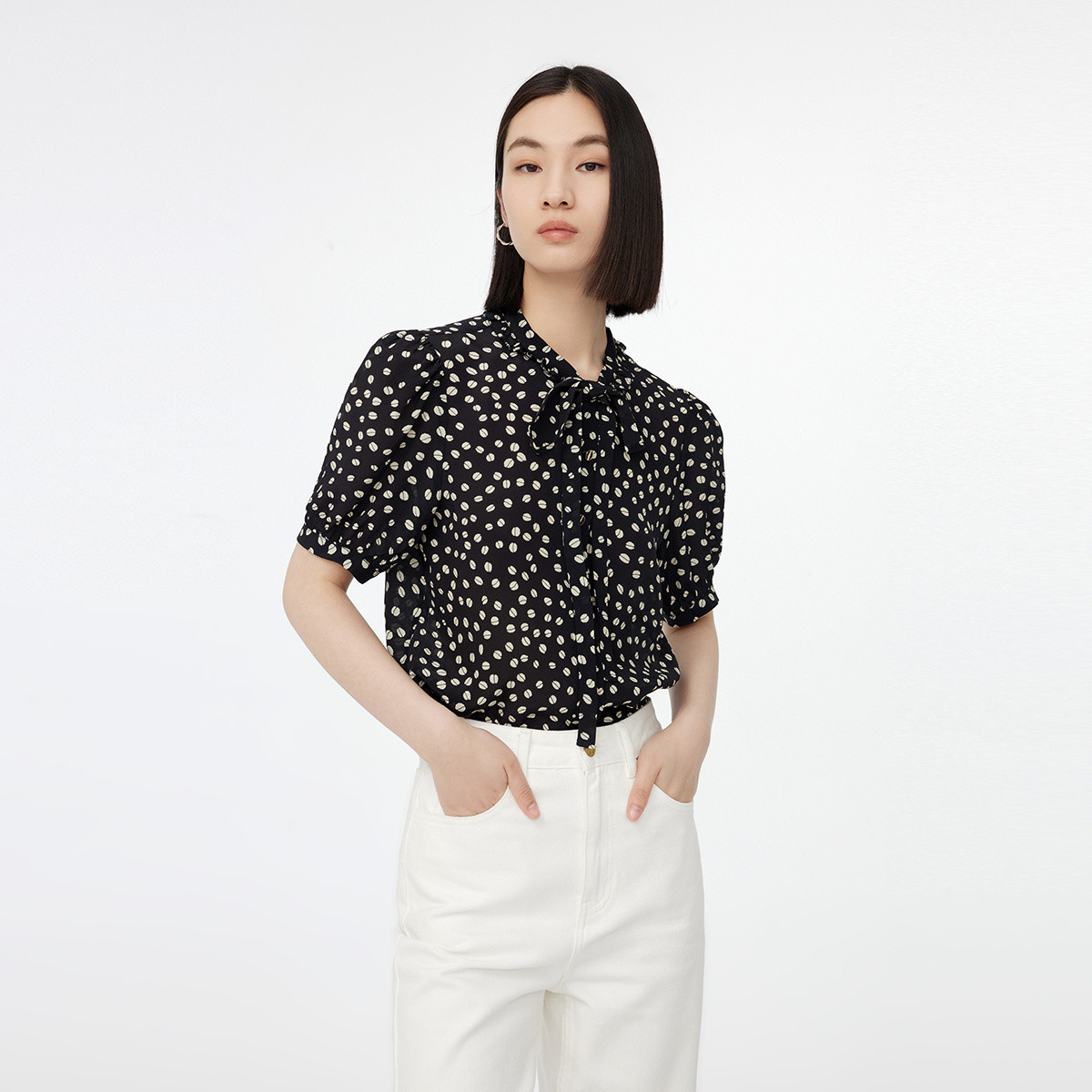 春季含真丝趣味印花别致飘带时尚通勤款泡泡袖衬衫 844891