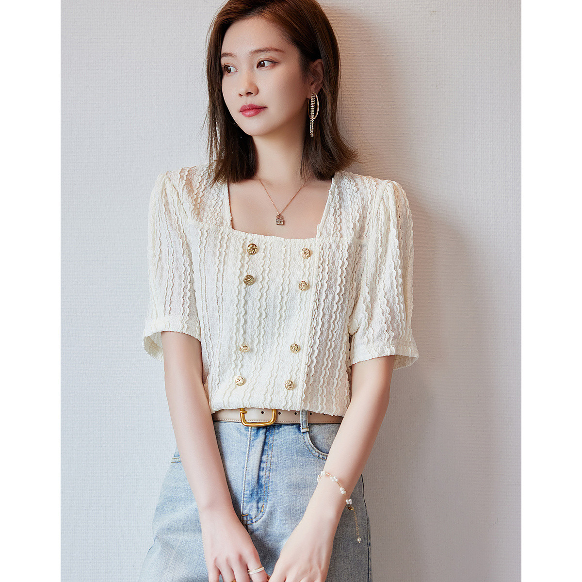 【法式复古方领衬衫】夏泡泡袖浮雕圆扣衬衣女装上衣 811777