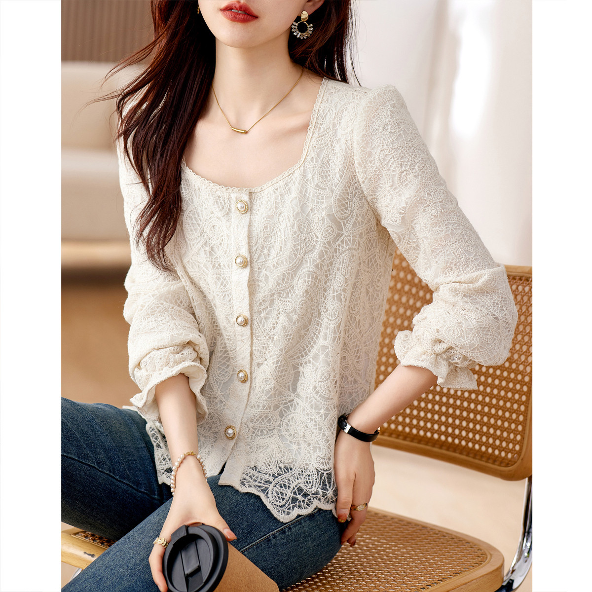 【优雅刺绣衬衫】秋方领甜美娃娃袖蕾丝衬衣女装上衣 129217