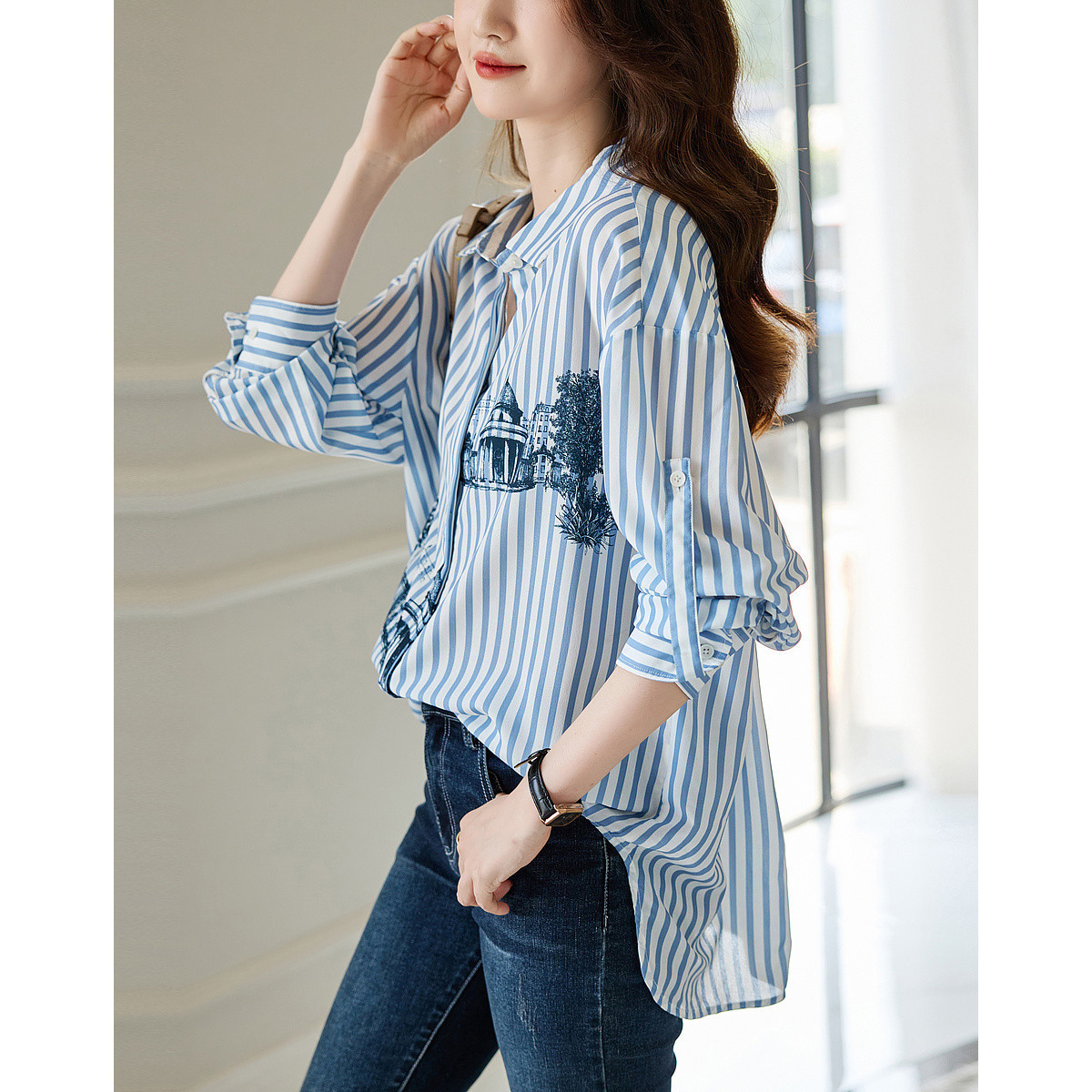 【城市漫游】春秋艺术感条纹建筑印花衬衫落肩舒适藏肉衬衣女上衣 736001