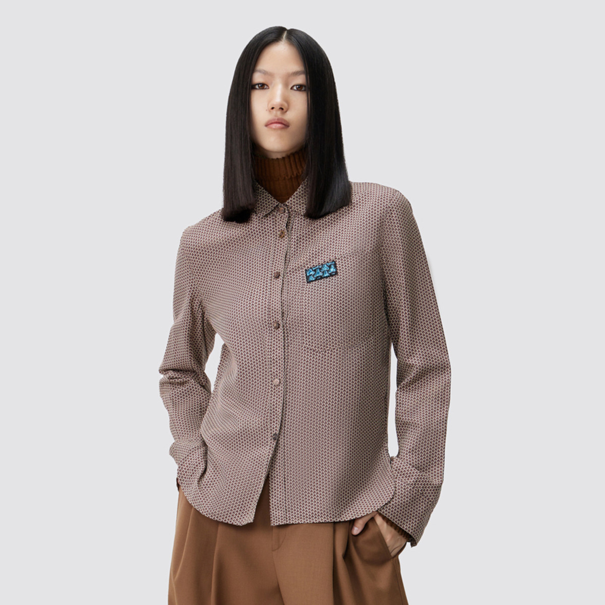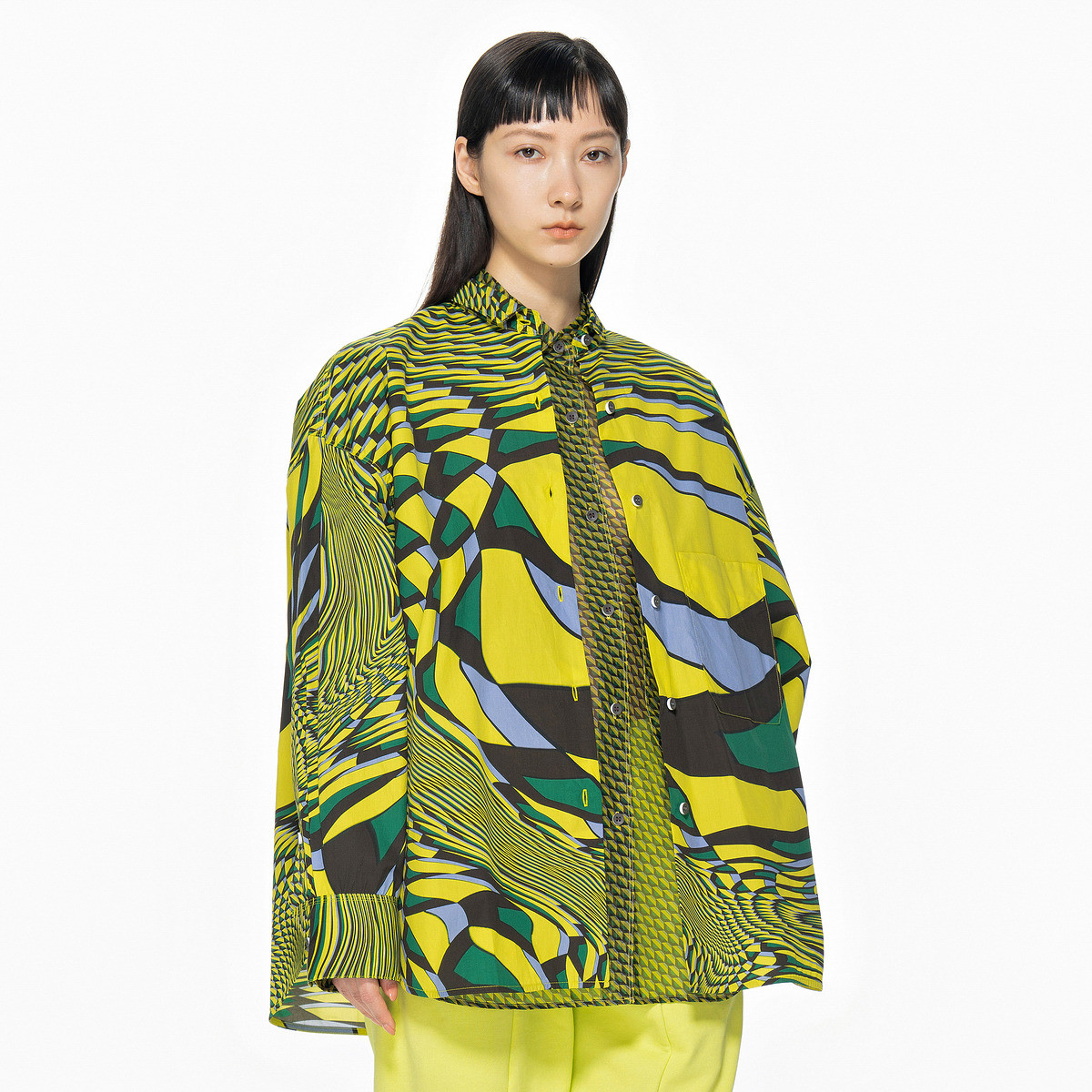 【缎面雪纺衬衫】秋款直筒长袖几何印花拼色衬衣女装上衣 961217