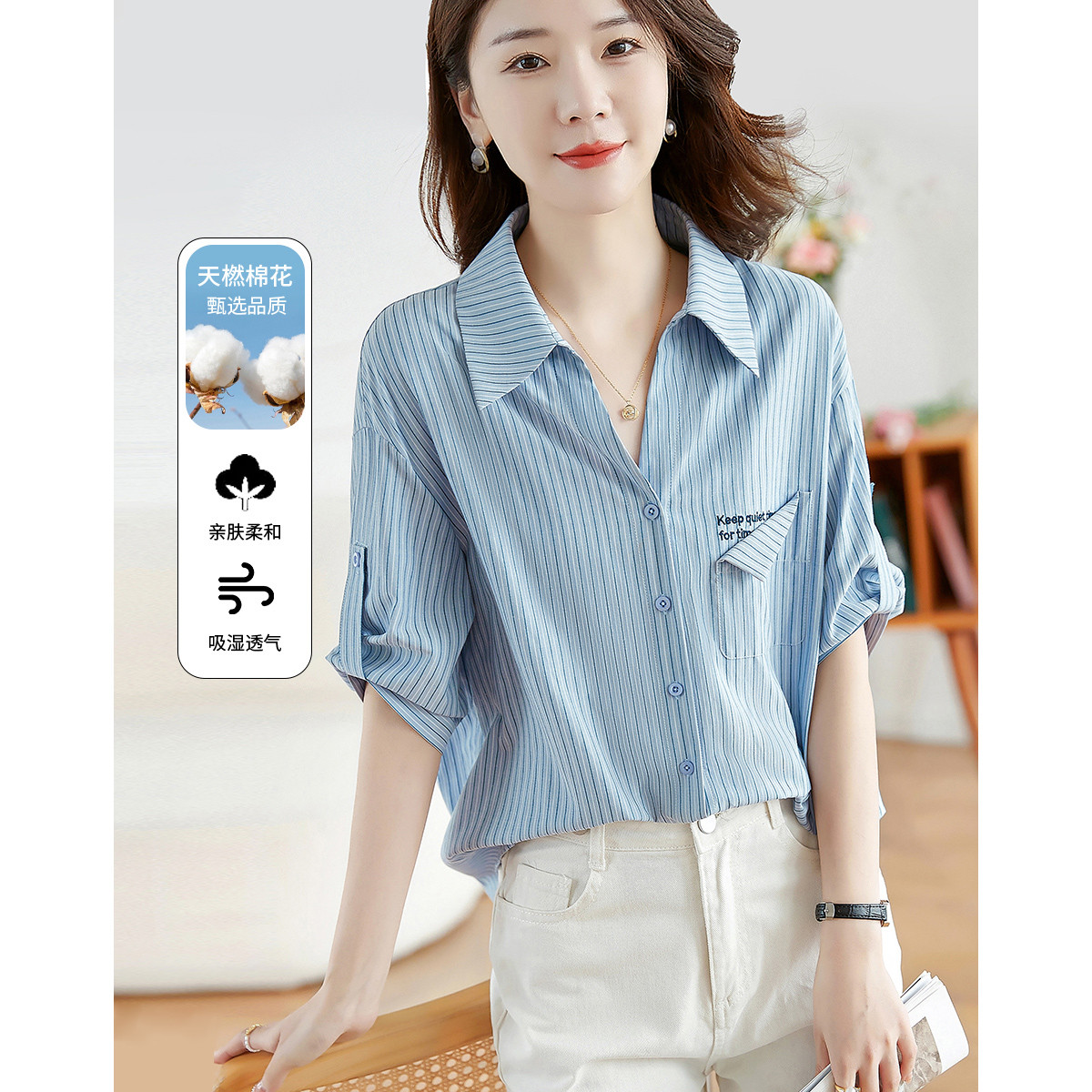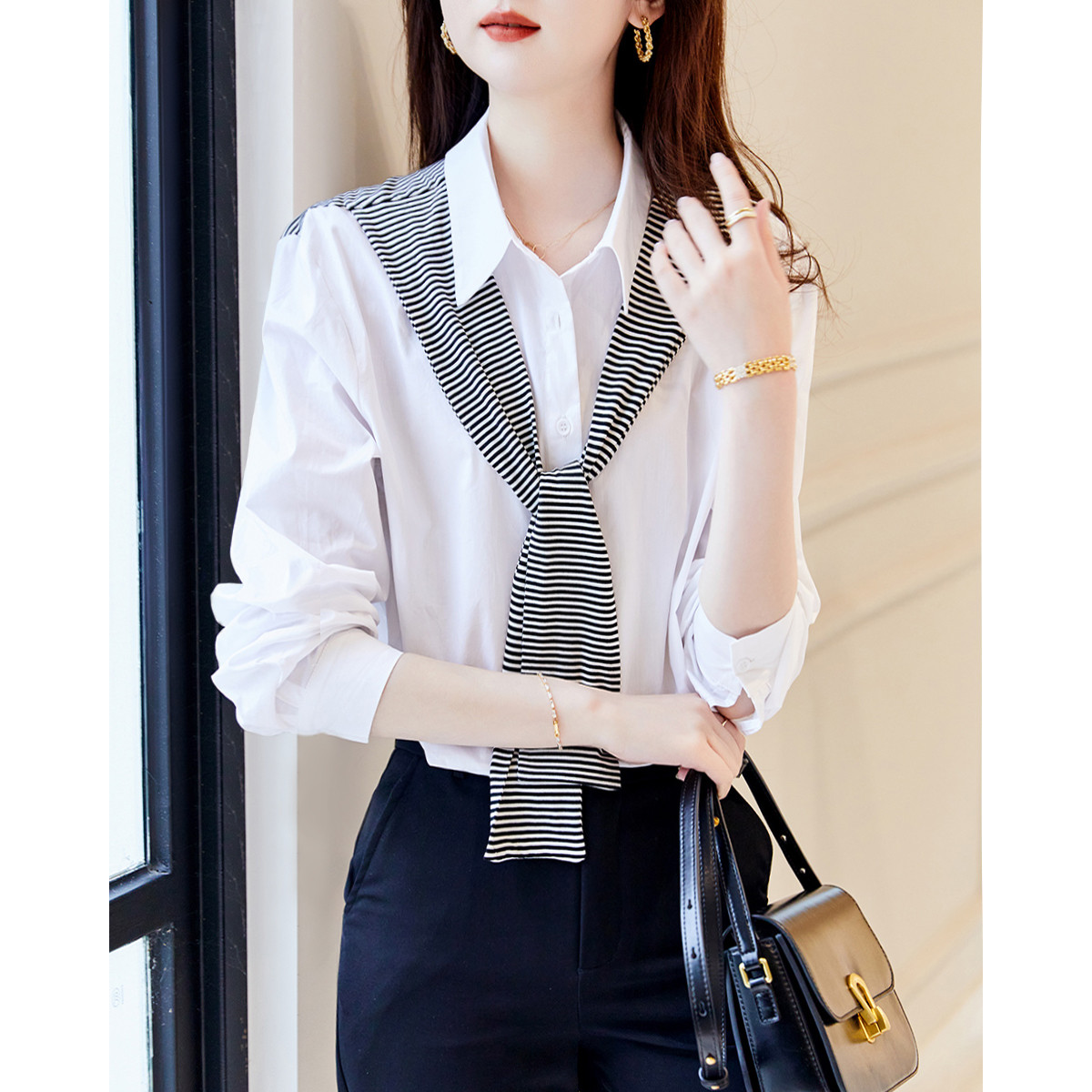 【条纹通勤休闲衬衫】春夏穿搭设计感简约百搭小衫女 893144