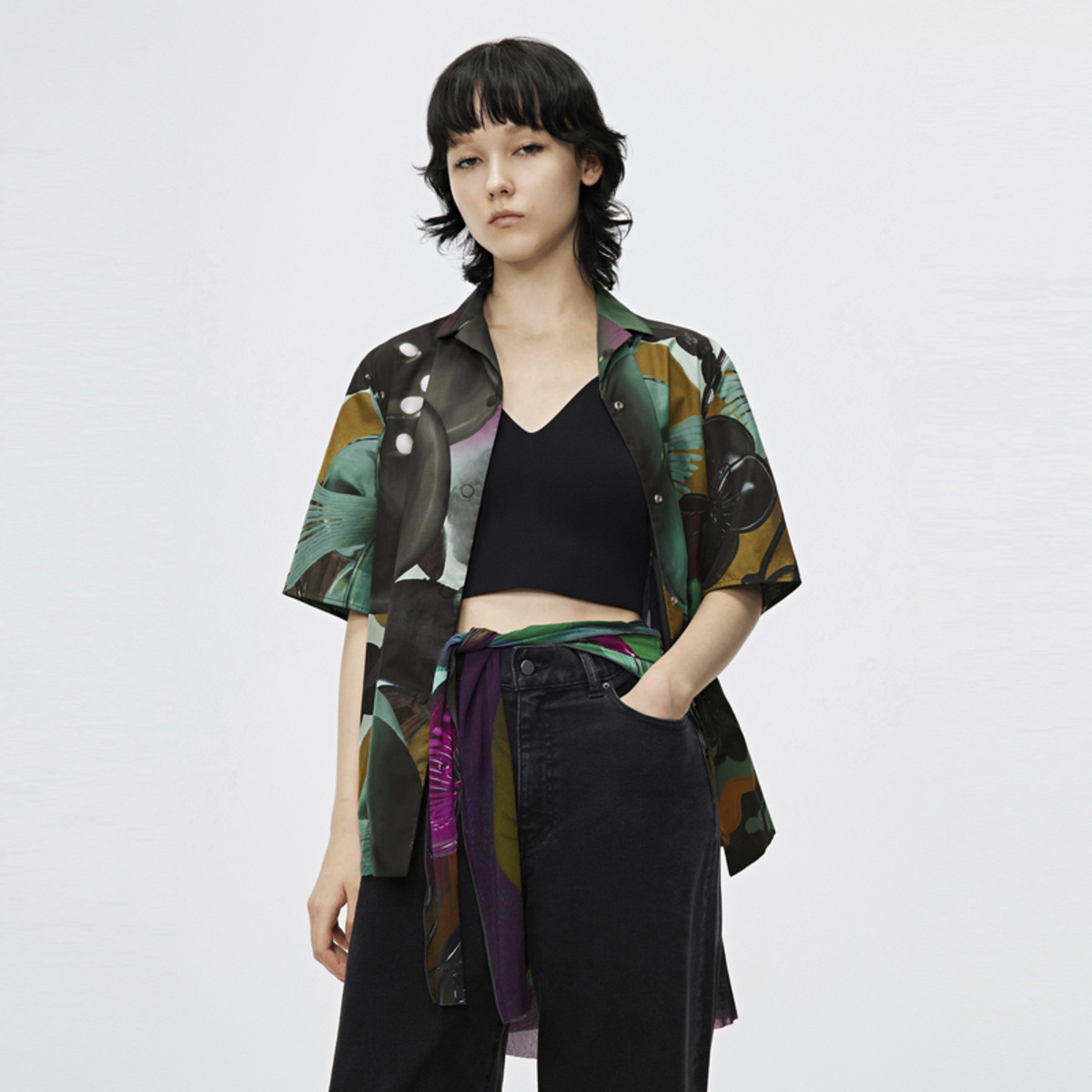 【时尚百搭】夏季百搭可拆卸蝴蝶结满印直筒衬衫女 083546