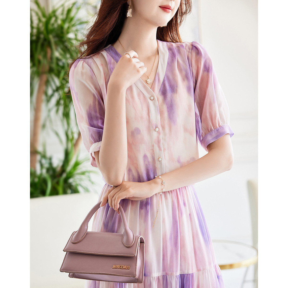 【油画风渐变晕染雪纺衬衫】夏V领短袖衬衣女装上衣 634753