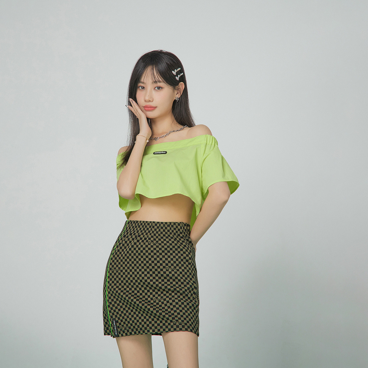 CHUU甜辣一字肩短款衬衫衫女夏贴标宽松短袖上衣 684947