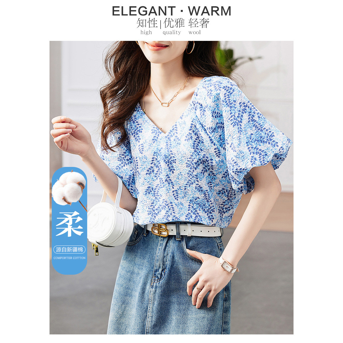 【清新印花衬衫】夏季V领泡泡袖衬衣女装上衣 955265