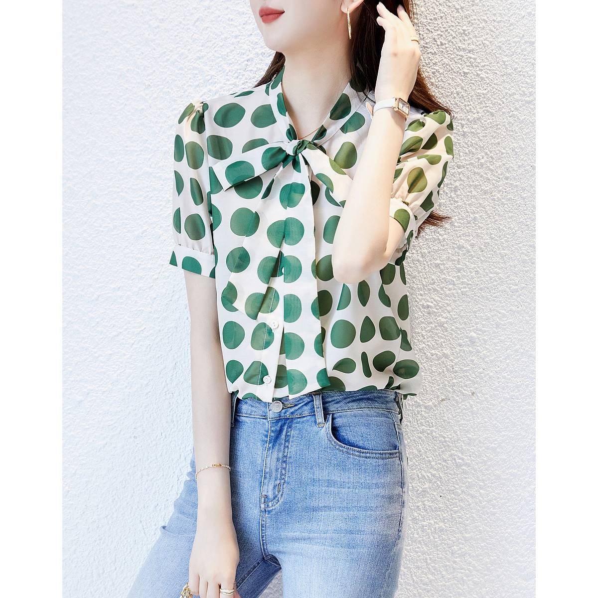 【系带领圆点印花衬衫】夏通勤短袖衬衣女装上衣 349377