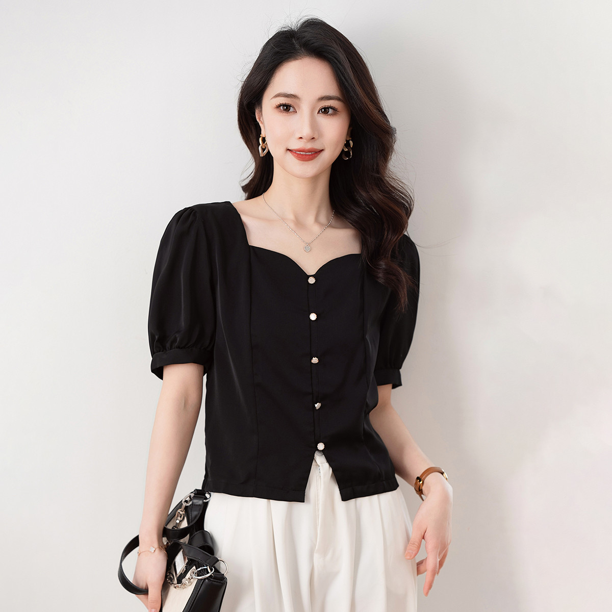 夏季方领短袖时尚通勤衬衫百搭女生短款雪纺衬衣潮 408344