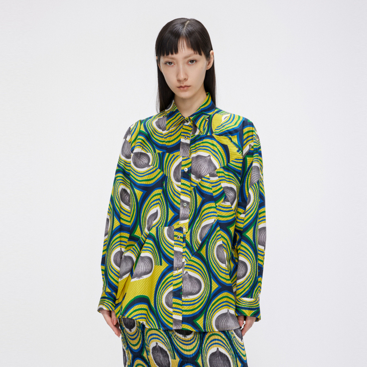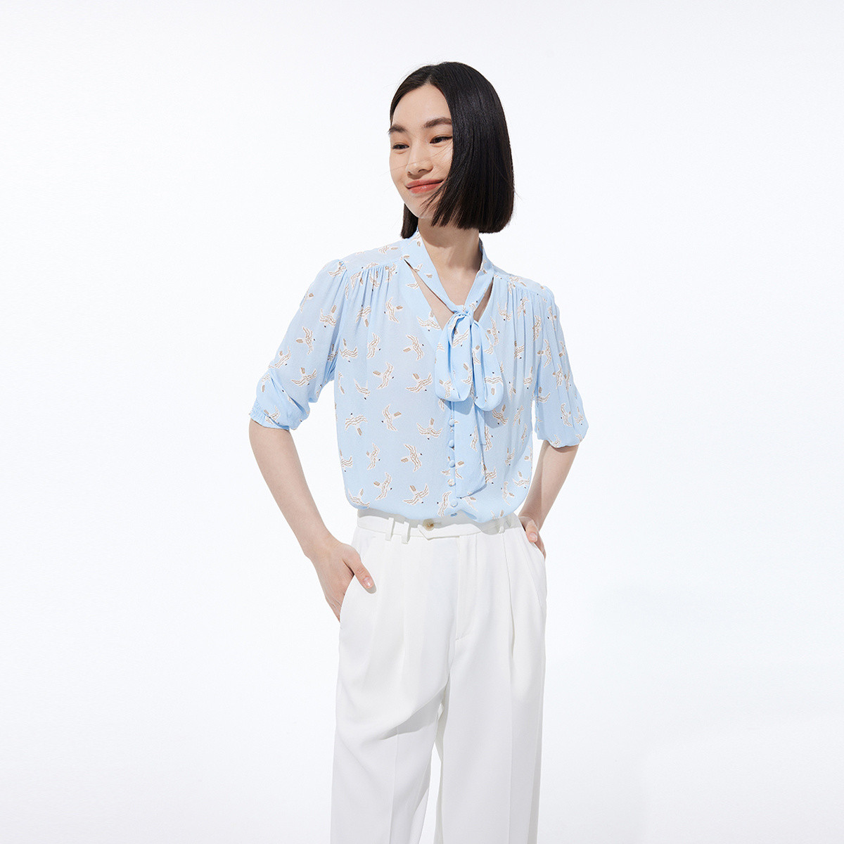 【时尚百搭】夏季百搭可拆卸蝴蝶结满印直筒衬衫女 083546