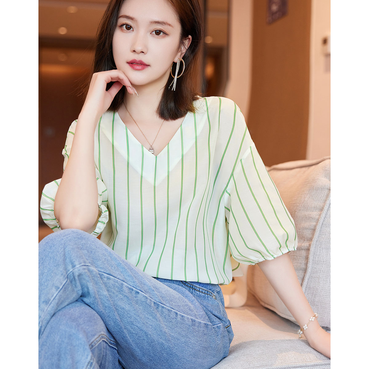 【条纹印花衬衫】夏V领通勤系带短袖衬衣女装上衣 257665