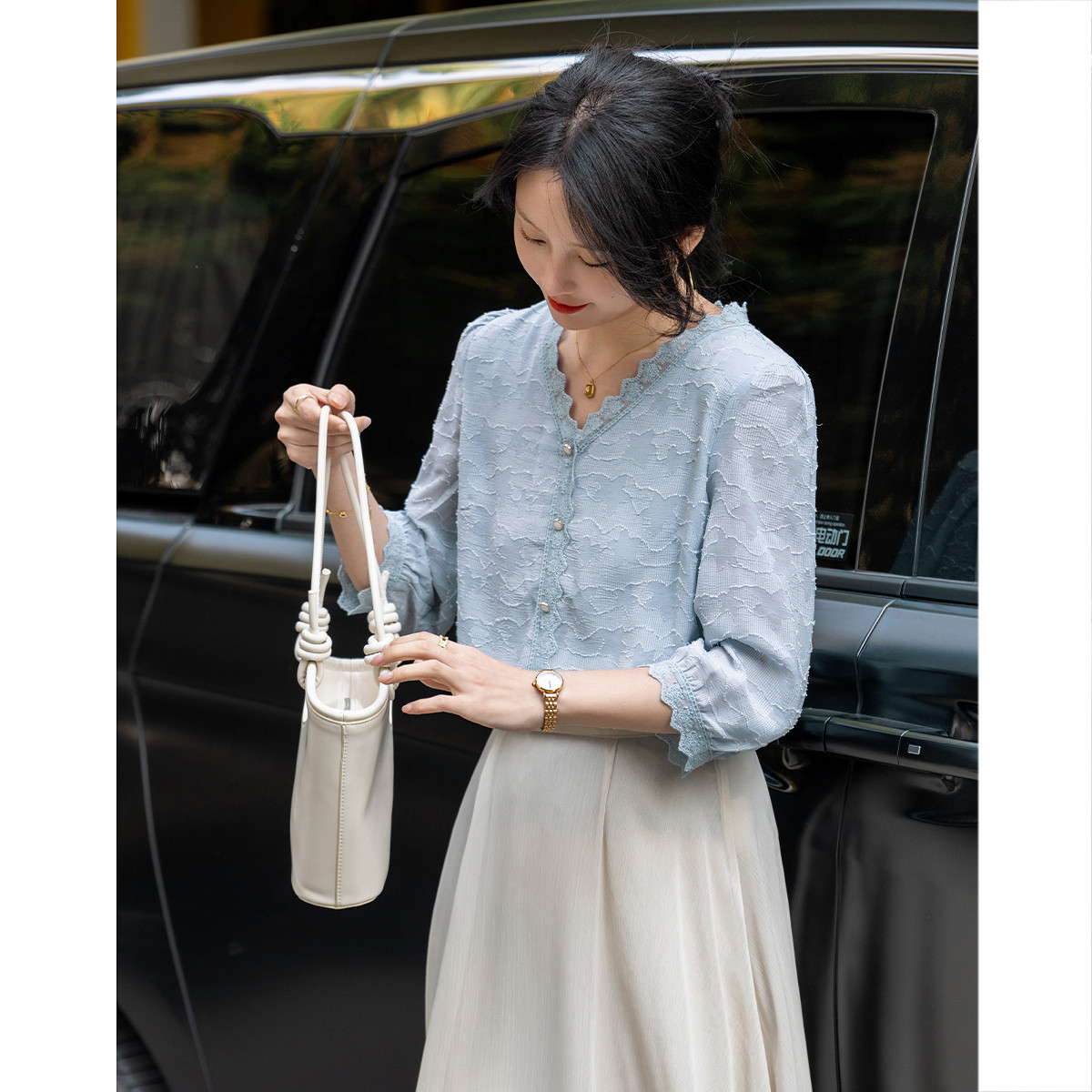 【好久不见系列】夏法式通勤V领提花衬衫七分袖蕾丝衬衣女装上衣 444417