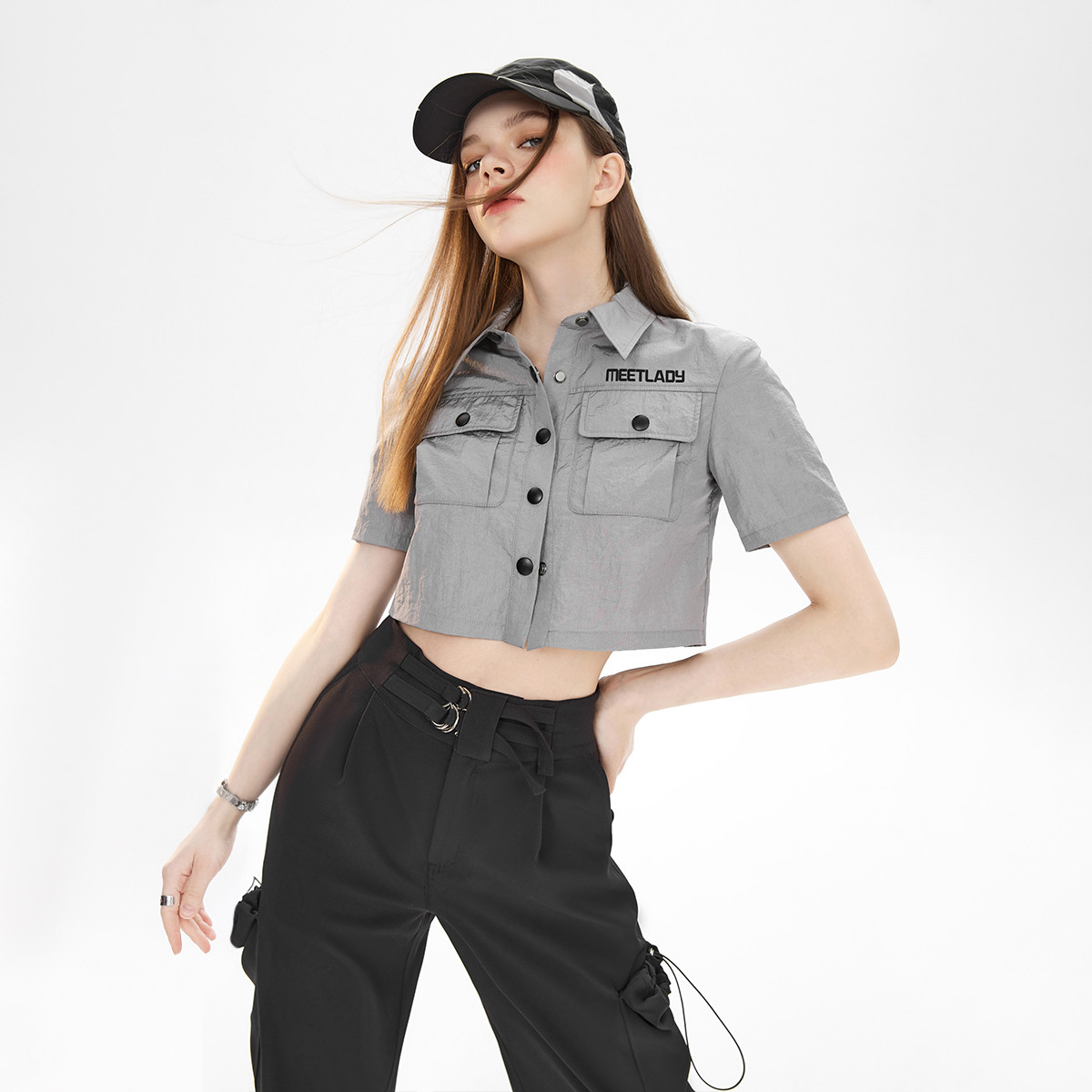 夏装工装风辣妹多口袋短款衬衫露脐设计轻巧上衣 173716