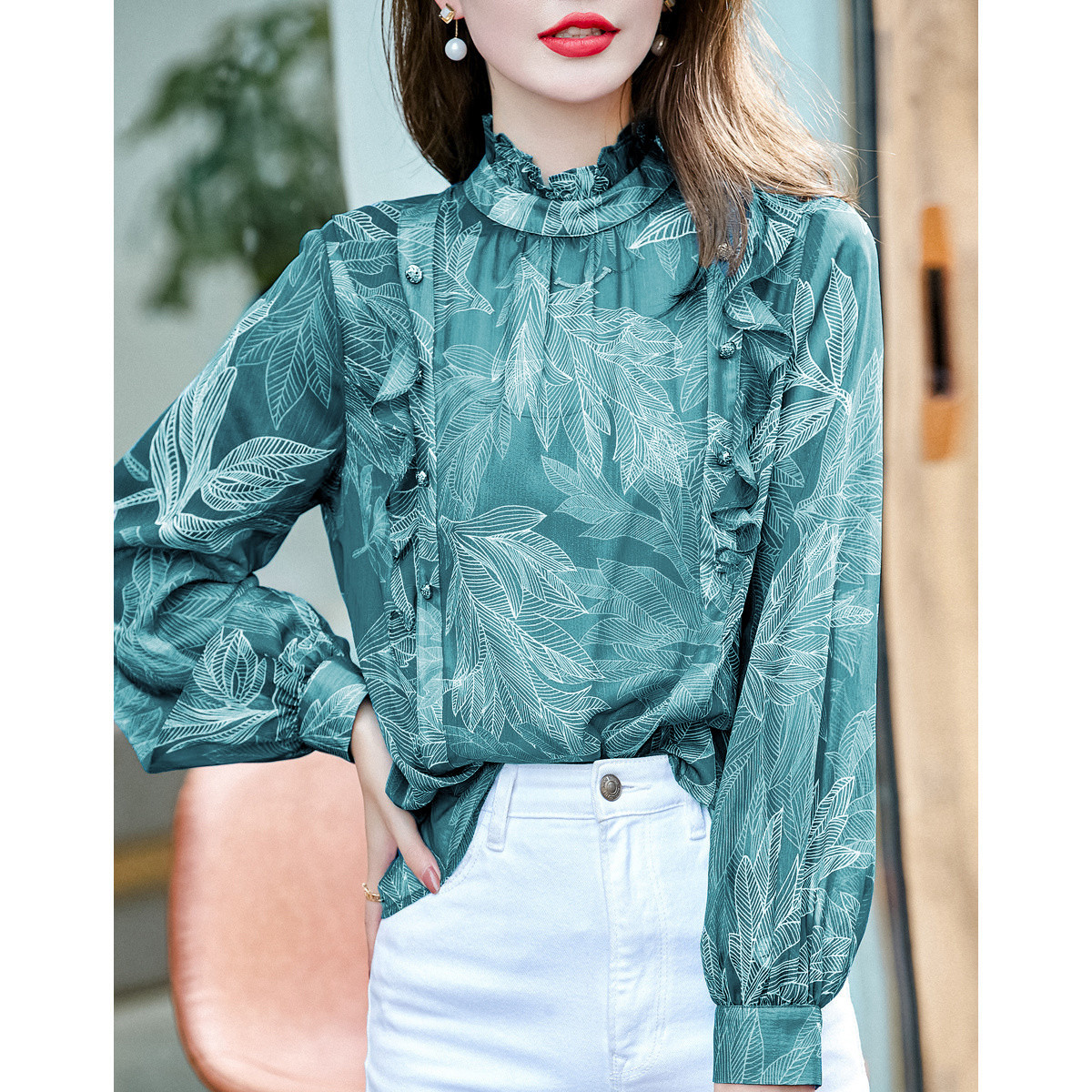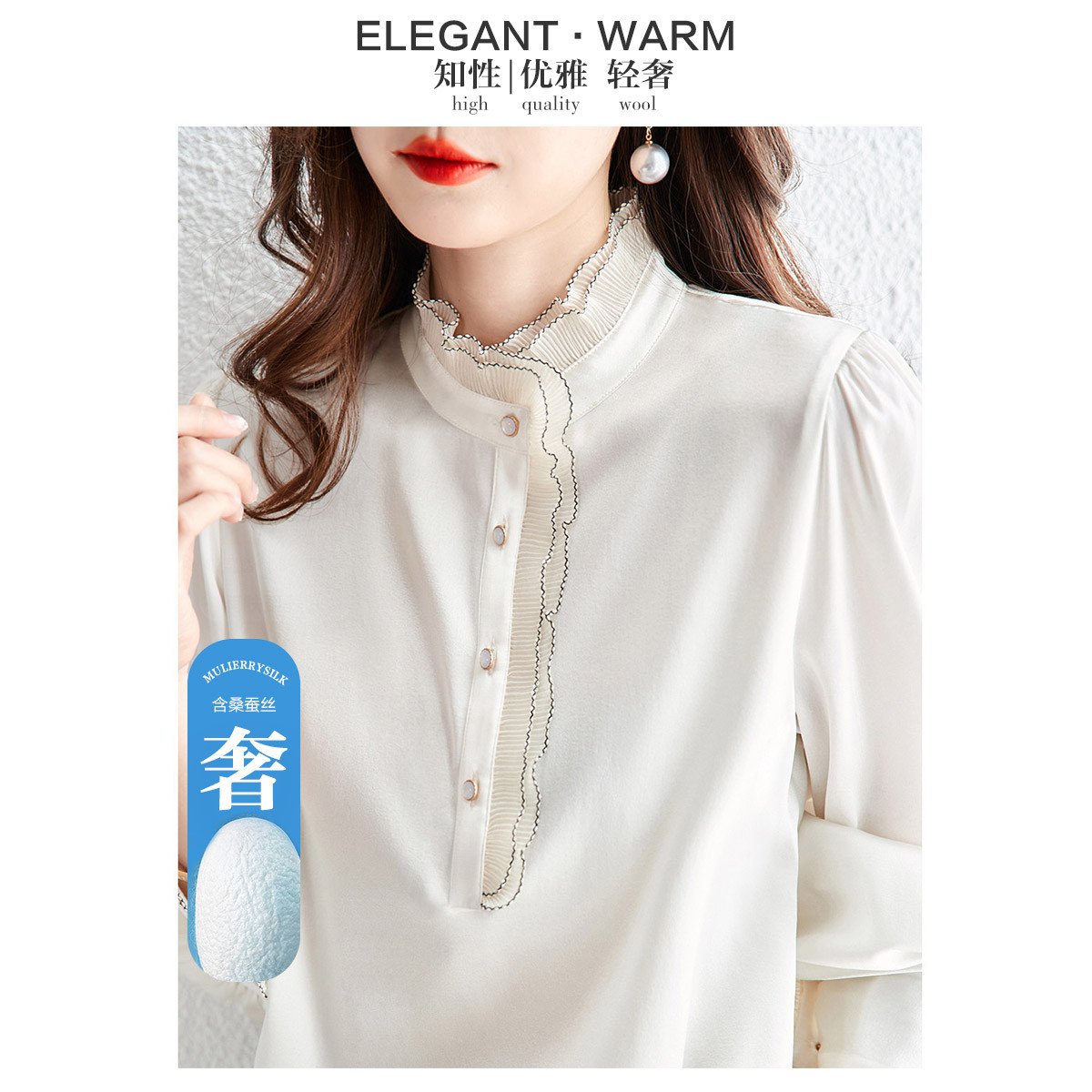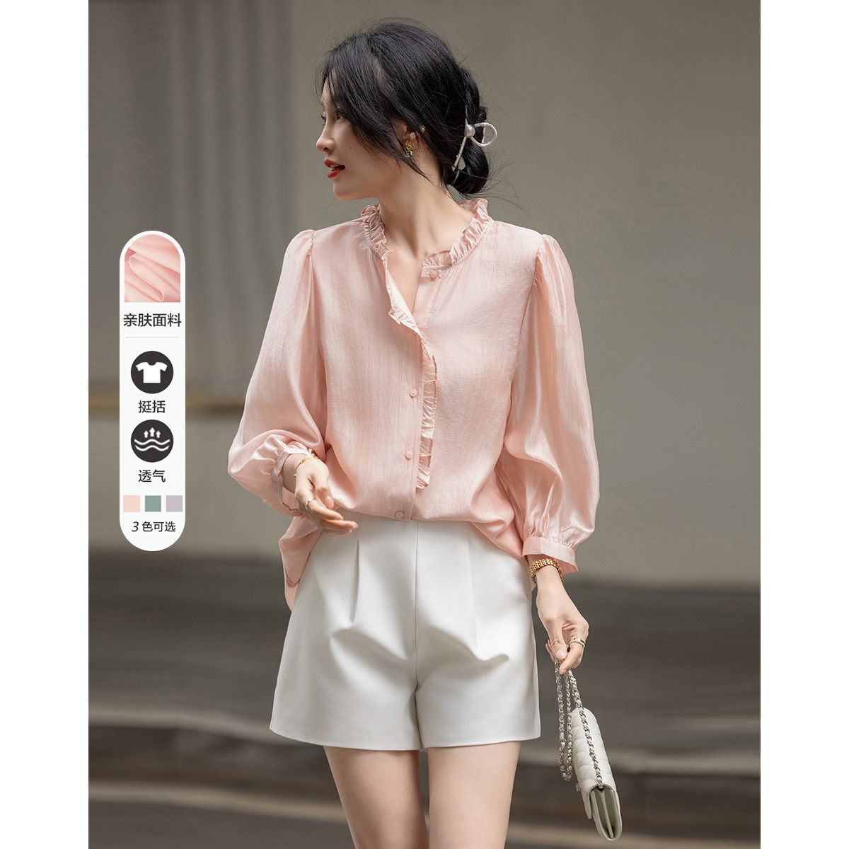 【珠光感莱赛尔】春秋法式圆领泡泡袖木耳边衬衫小个子衬衣女上衣 959041