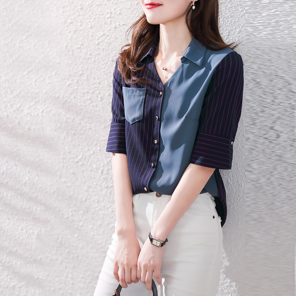春时尚拼接休闲女式衬衫显瘦H型女式上衣V领气质衬衣女 131841