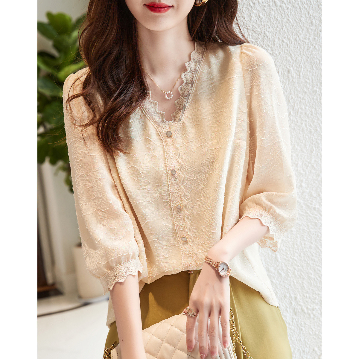 【好久不见系列】夏法式通勤V领提花衬衫七分袖蕾丝衬衣女装上衣 446593