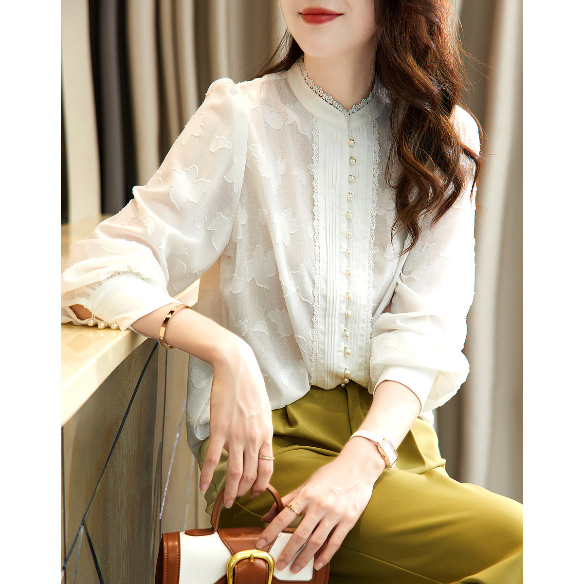 【剪花衬衣】春秋新立领宽松长袖单排扣优雅衬衫女春秋季上衣 049921