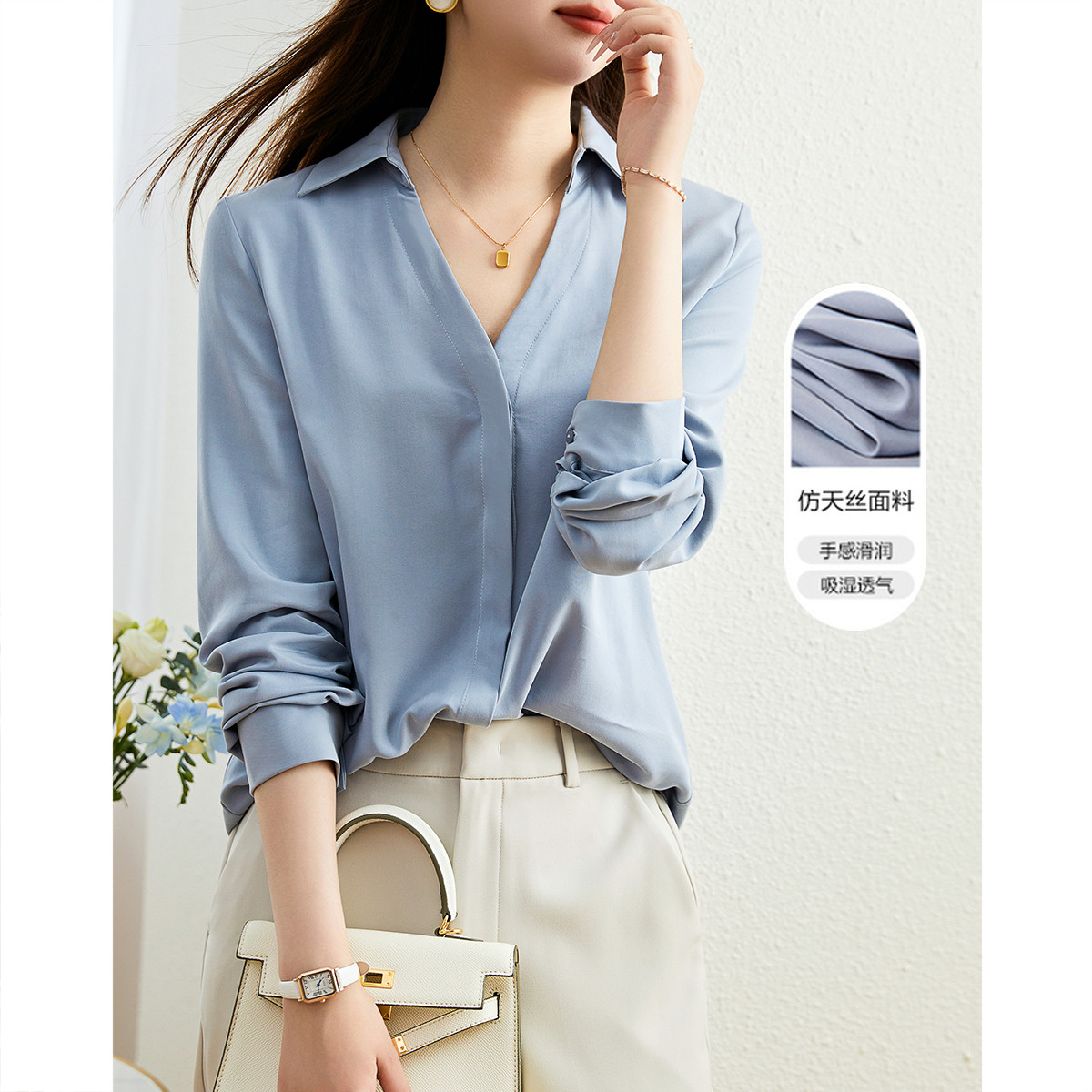 【仿天丝高弹衬衫】春秋V字翻领气质衬衣女式上衣 754369