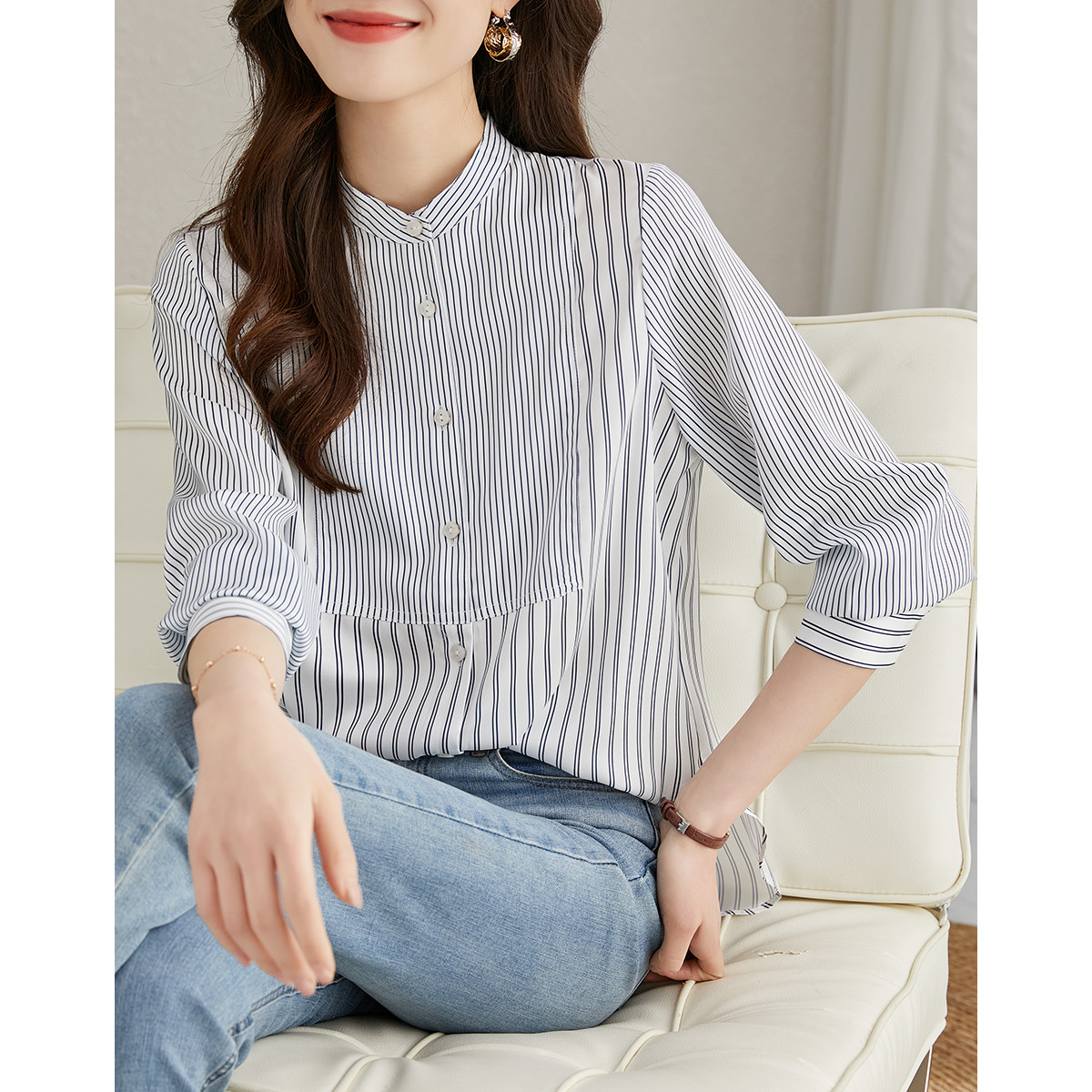 【通勤条纹衬衫】春秋立领长袖拼接衬衣女装上衣 901697