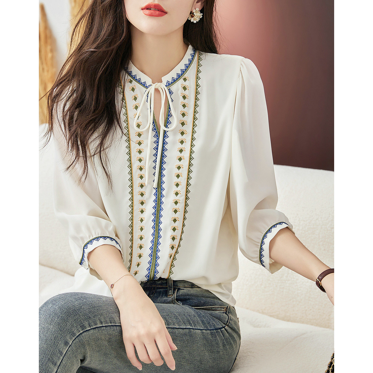 【绣花工艺】春秋抽绳几何宽松泡泡袖七分袖复古衬衫女 527361