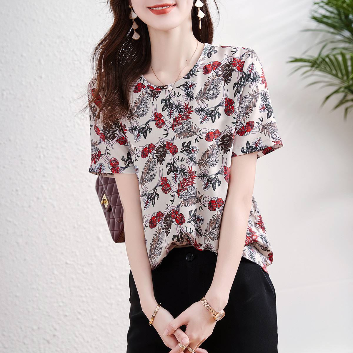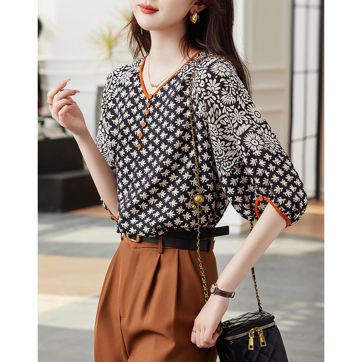 【复合丝花瑶衬衫】夏季V领撞色印花衬衣女装上衣 103937