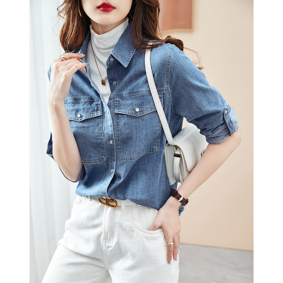 【复古水洗色】春季女装时尚高级感牛仔衬衫女式叠穿打底上衣衬衫 266626