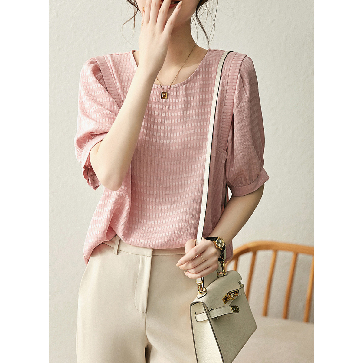 【细丝提花格纹衬衫】夏圆领泡泡袖抽皱衬衣女装上衣 152321