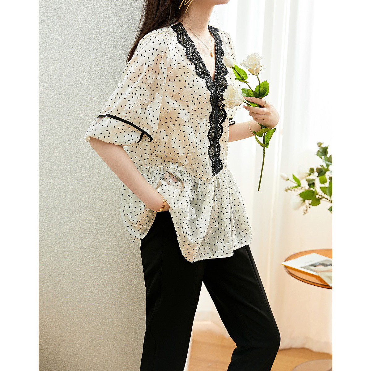 【淑女花边波点衬衫】春秋V领七分袖蕾丝衬衣女装上衣 547137