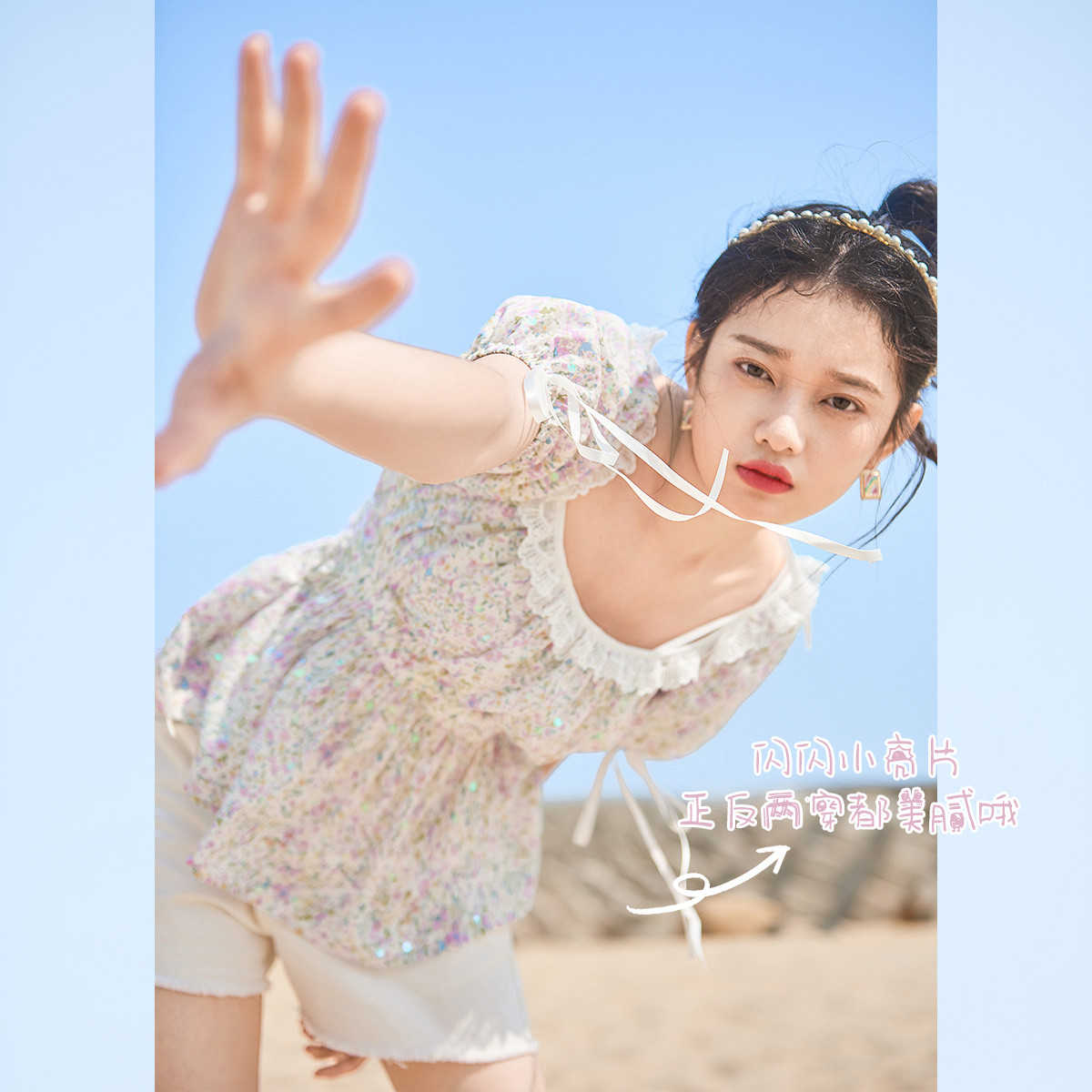 夏装方领绑带泡泡袖雪纺衫女收腰时尚亮片印花衬衫 678868