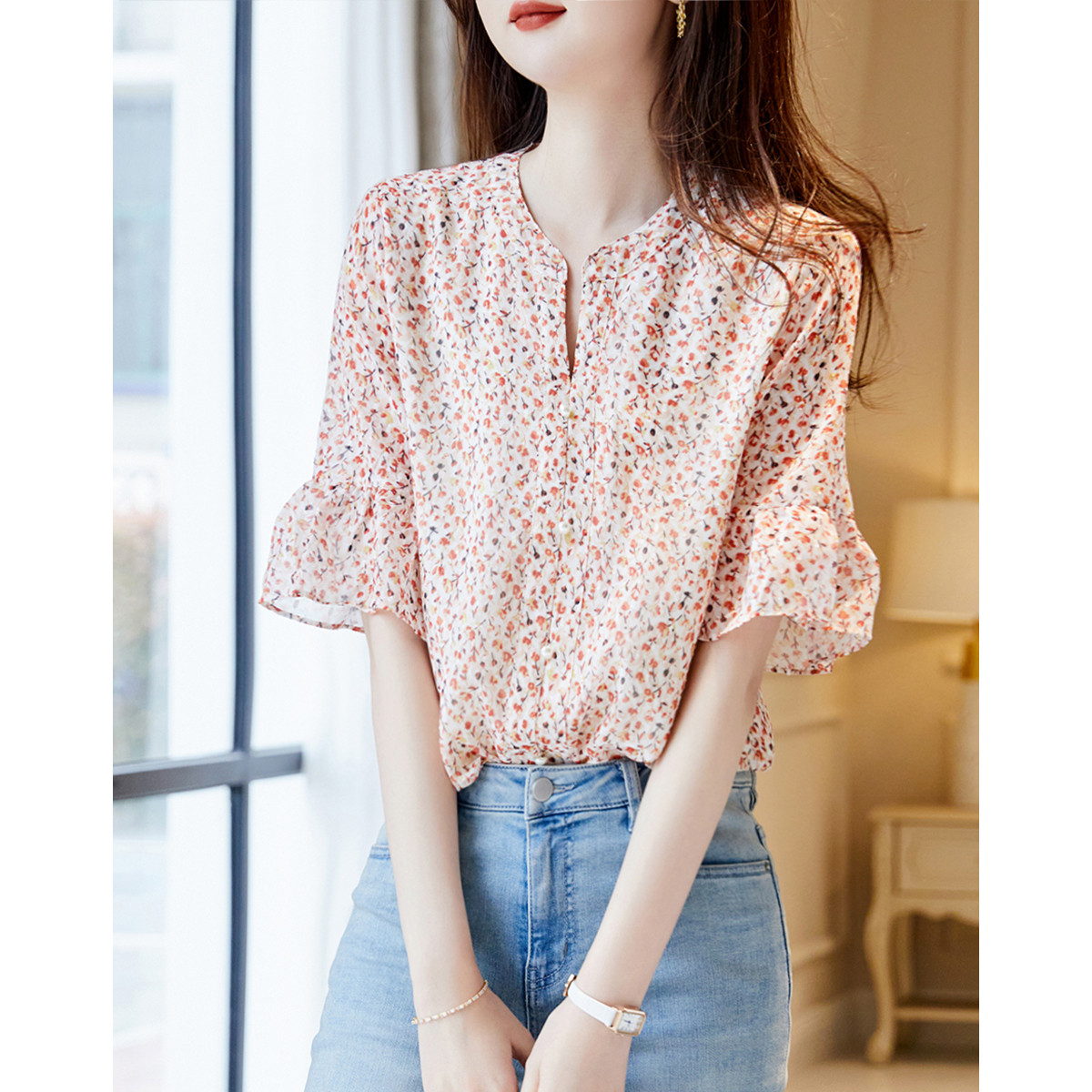 【甜美泡泡袖衬衫】夏V领木耳边碎花衬衣女装上衣 310913