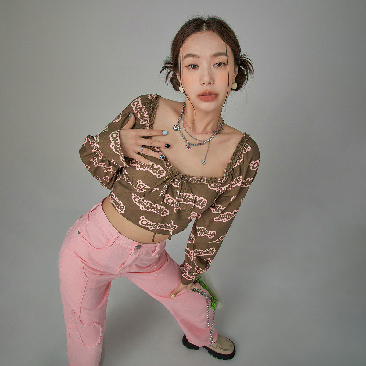 CHUU字母印花长袖女春夏秋含胸垫木耳边卡腰小衫 619987