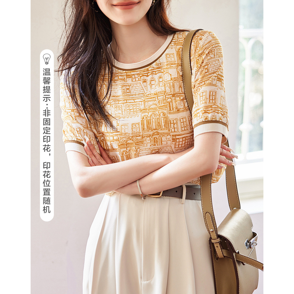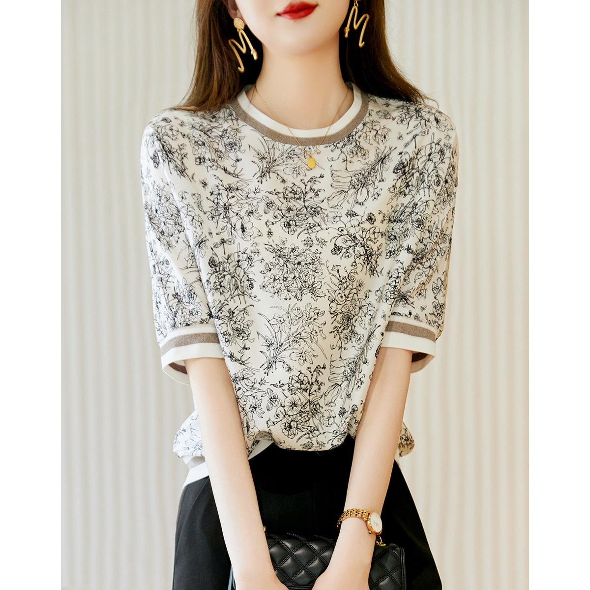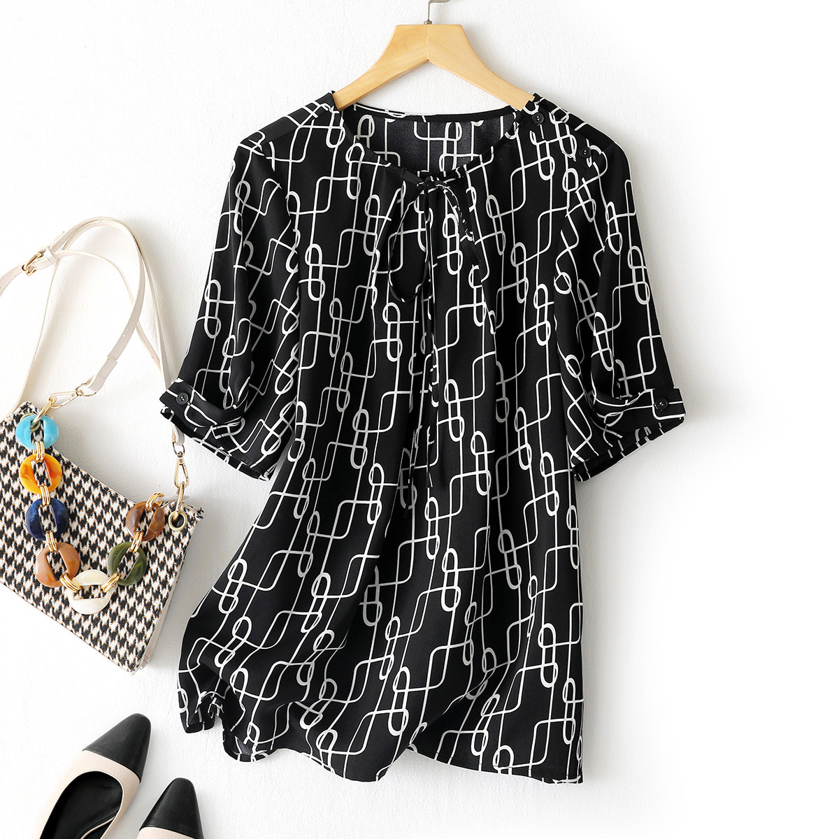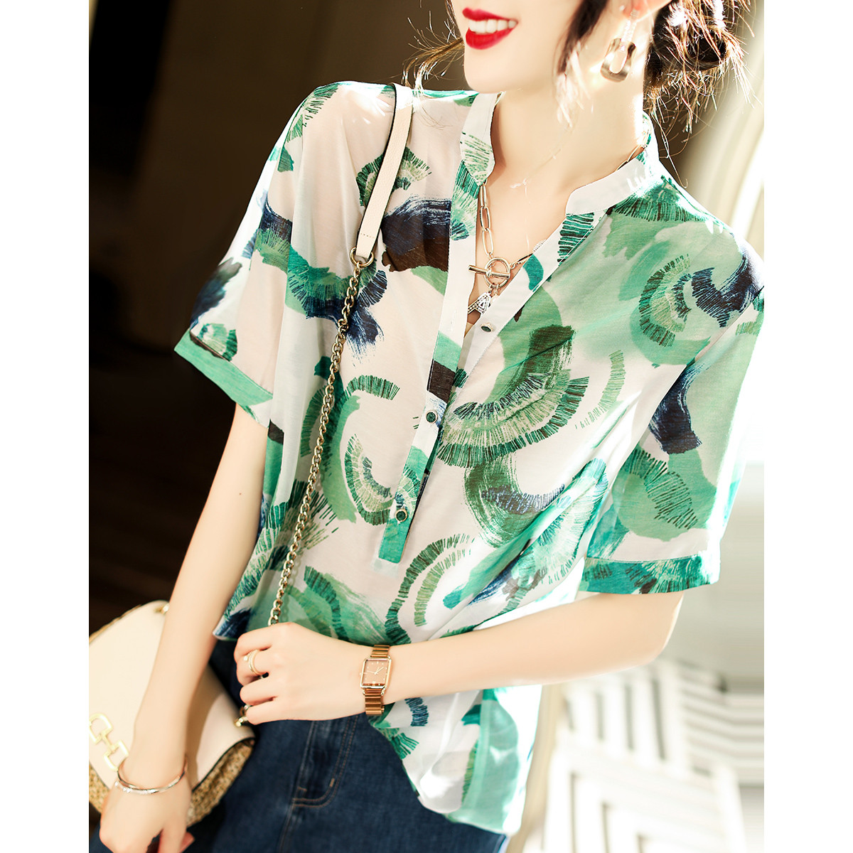 【水墨印花】夏金银丝圆领连肩袖五分袖衬衣女式上衣 078913