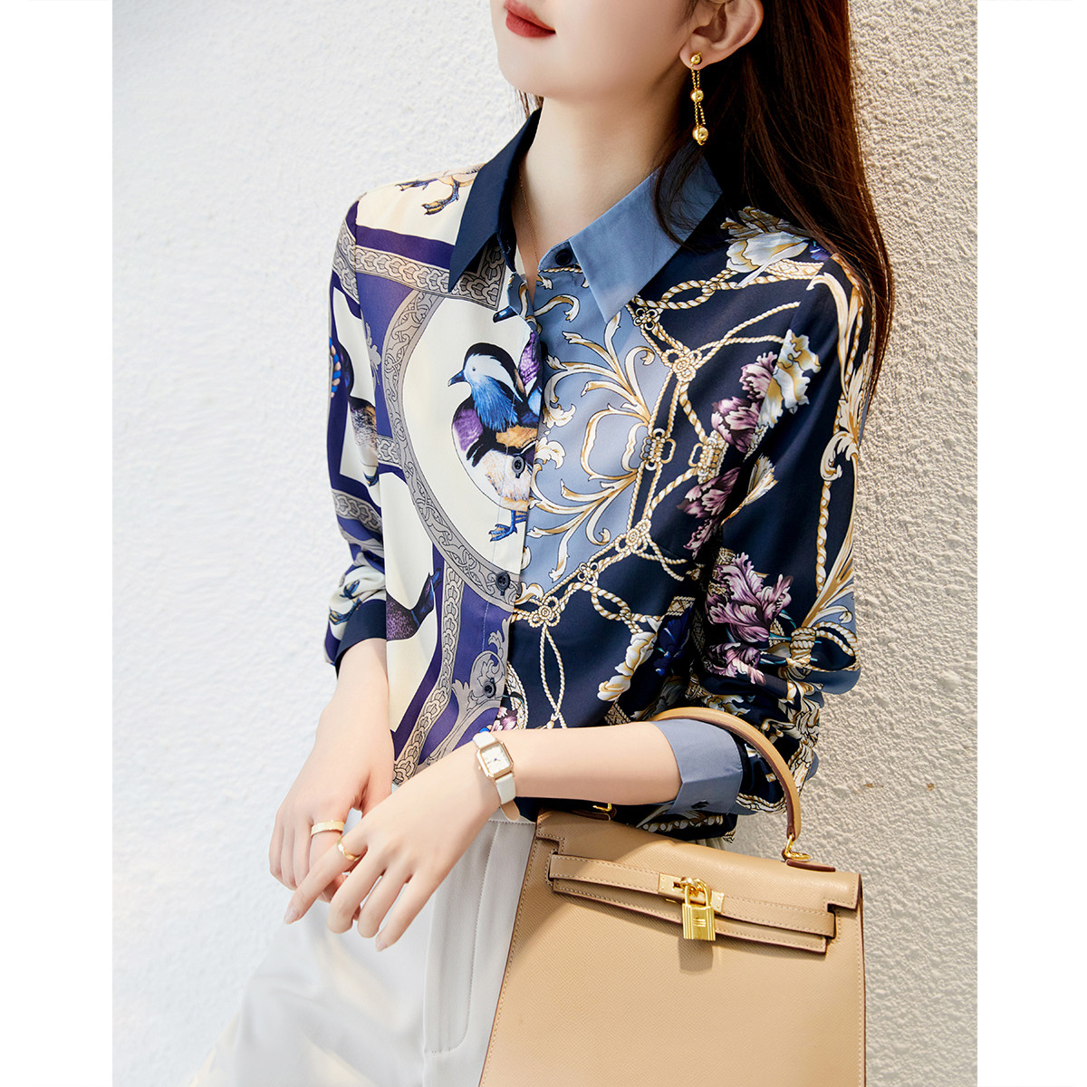 【宫廷花鸟印花】春秋新翻领长袖拼色宽松衬衣女春秋季上衣 601473
