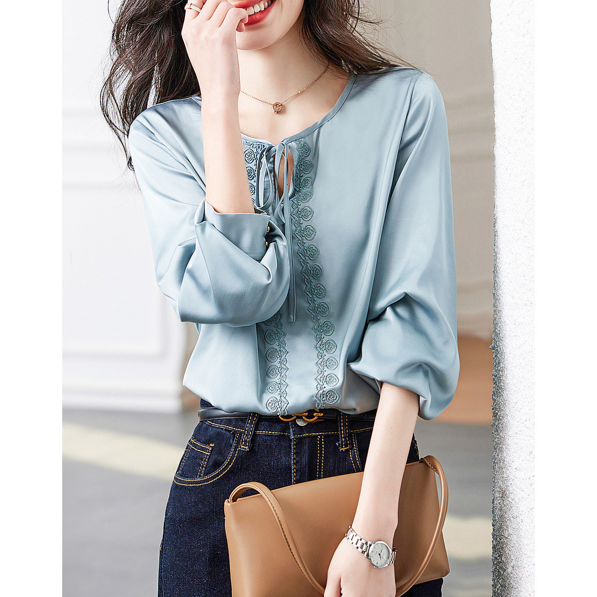 【雅致刺绣弹力缎衬衫】春秋系带长袖衬衣女装上衣 636865