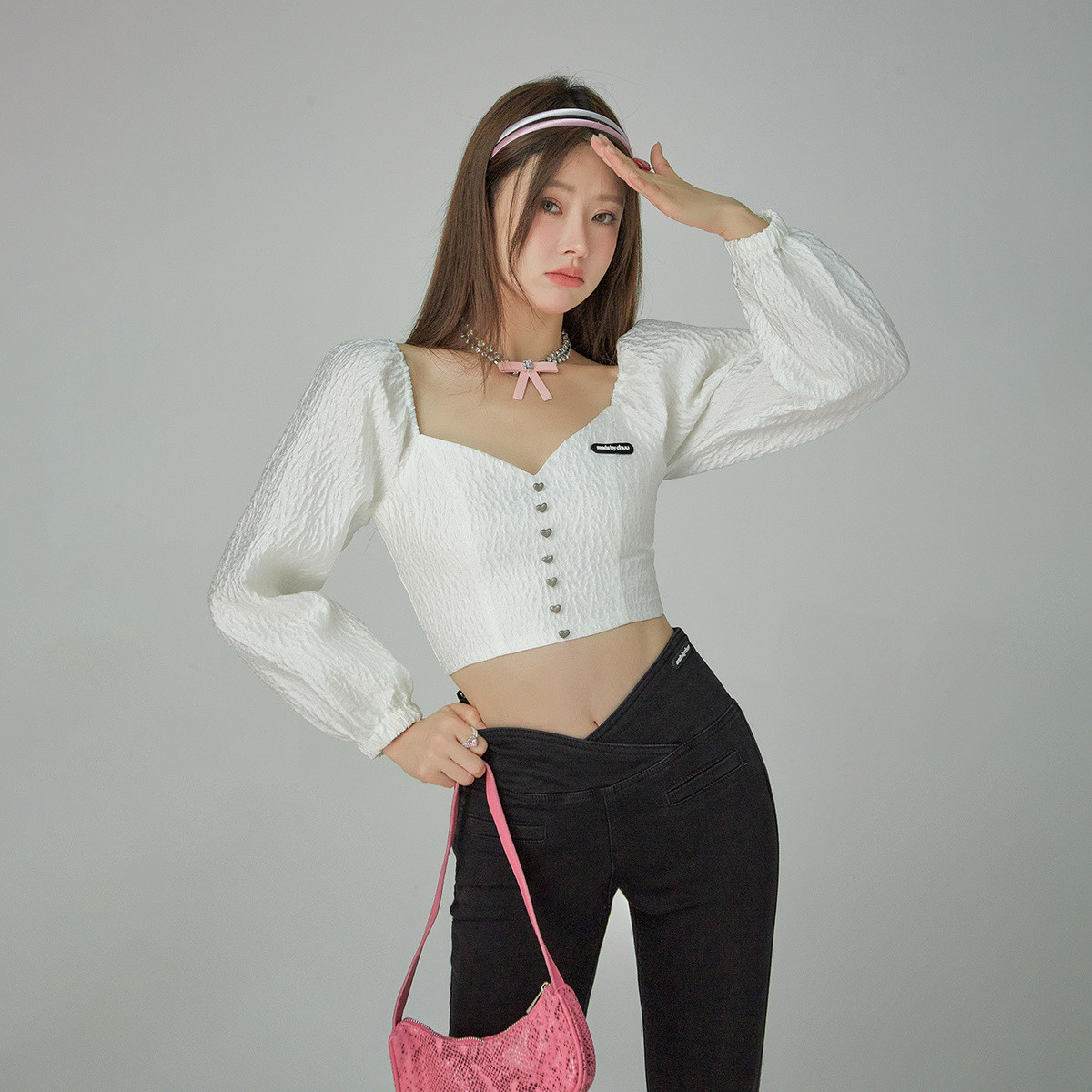 CHUU白色露锁骨长袖雪纺衫女春夏秋修身短款上衣 622419