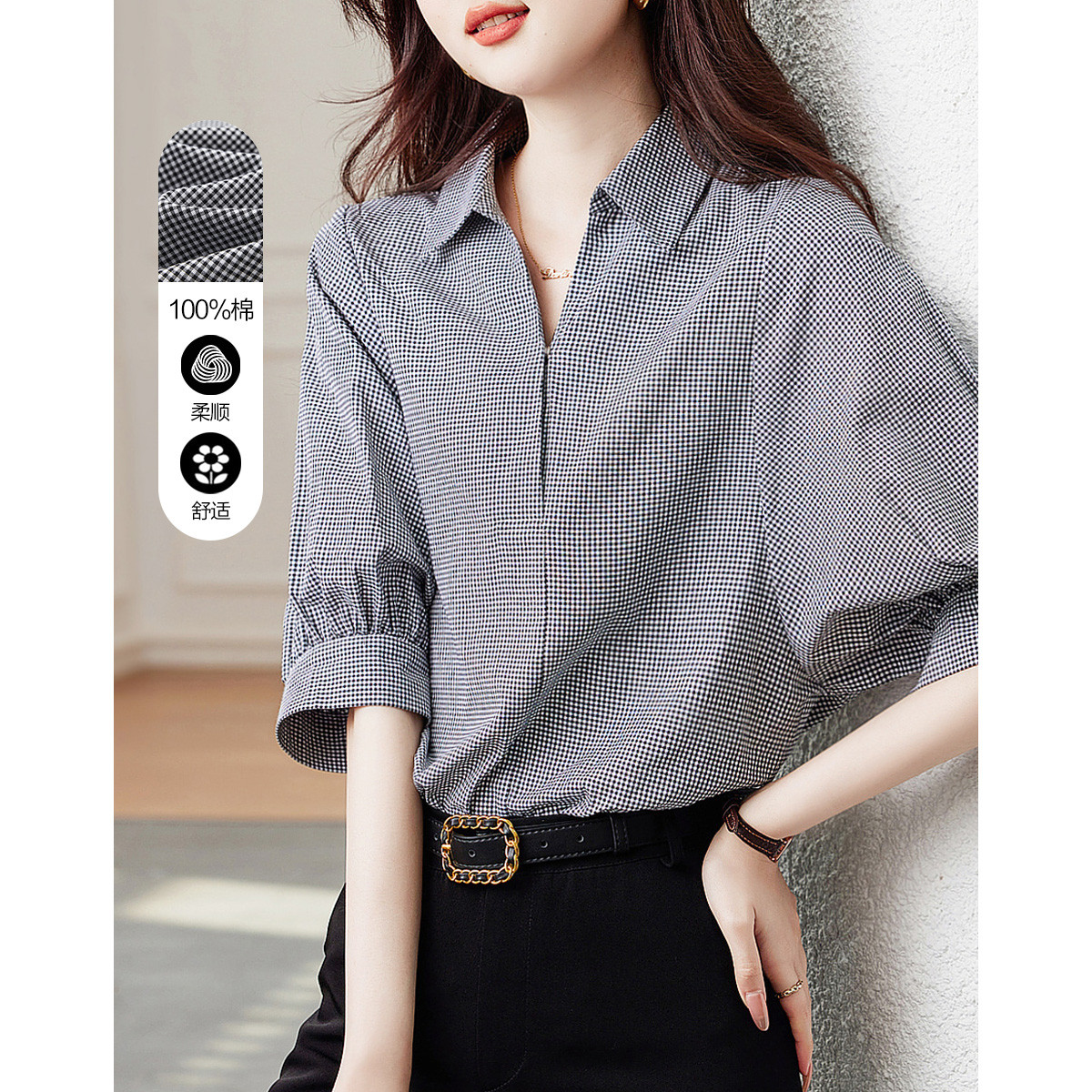 【馥芮恋歌】夏格雷系V字翻领衬衣复古格纹舒适藏肉衬衫女装上衣 040705